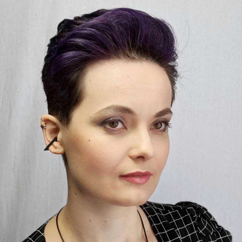 - Пикси. Только актуальна уже не с удлиненной челкой, а с косой или рваной. Она придаст небольшой объем на макушке, при этом поможет скрыть некоторые недостатки.