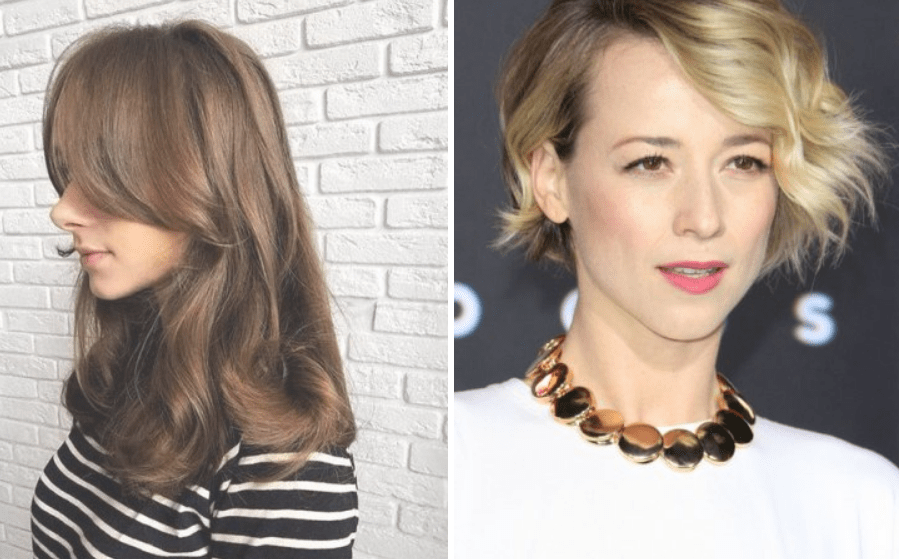 • Удлиненное лицо прекрасно сочетается с чёлкой на две стороны на средние или длинные волосы. Данный прием позволяет зрительно сделать лицо короче, а лоб уже.
