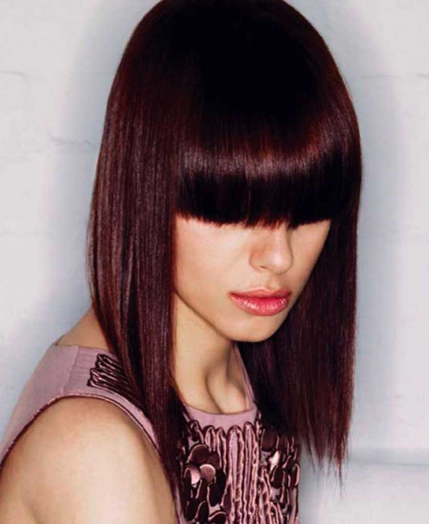 Боб-каре с челкой на темных волосах выглядит интереснее с красными прядями. Они могут начинаться сразу же на челке.