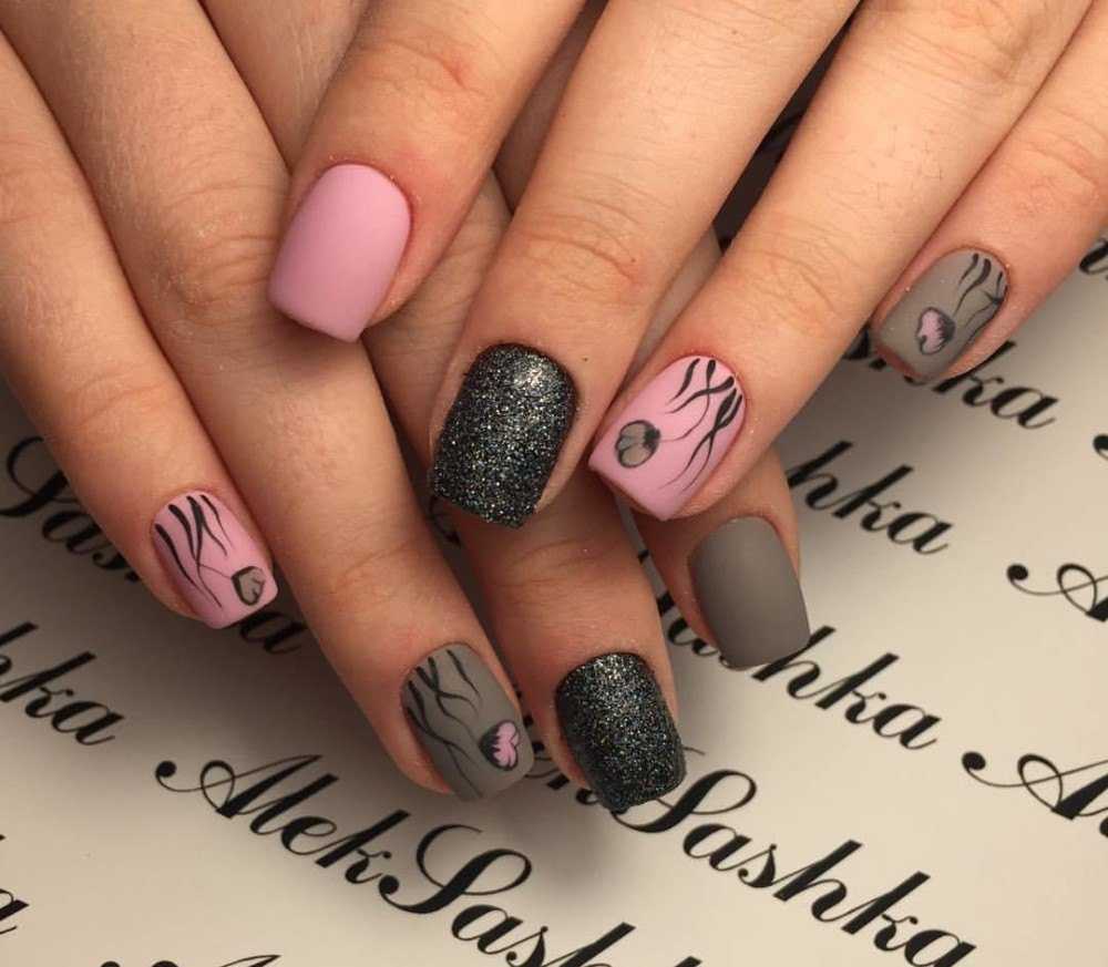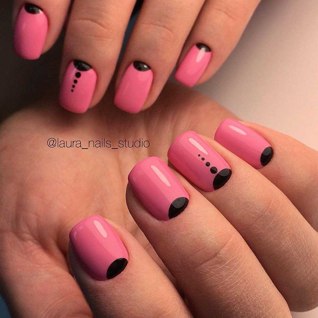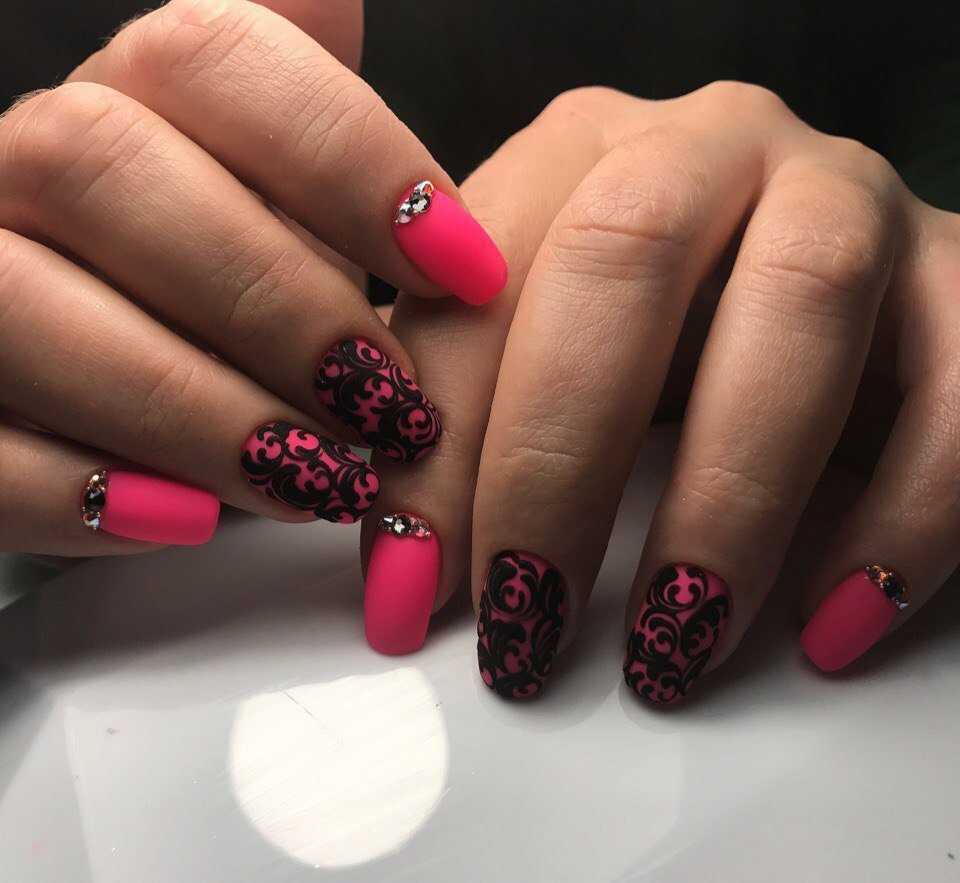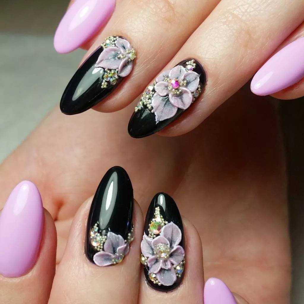 Так как розовый цвет сам по себе достаточно нежный, то он отлично подходит для создания изящного цветочного рисунка на ноготках. Он может быть в минималистичном стиле или наоборот, более крупным, объемным. Чаще всего черный цвет используется в качестве основы. Также иногда мастера добавляют в дизайн еще один нейтральный оттенок, который служит своеобразной подложкой. Дополнительный декор будет к месту, но только в том случае, если он не слишком крупный.