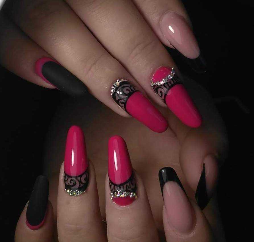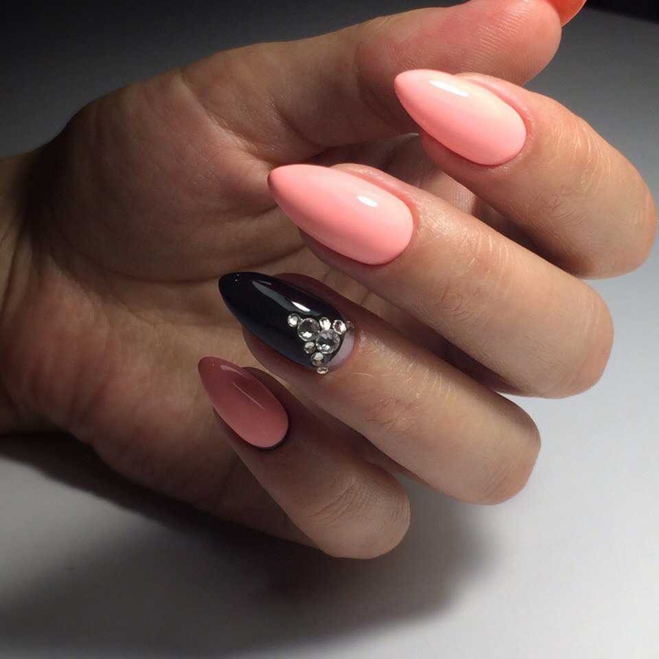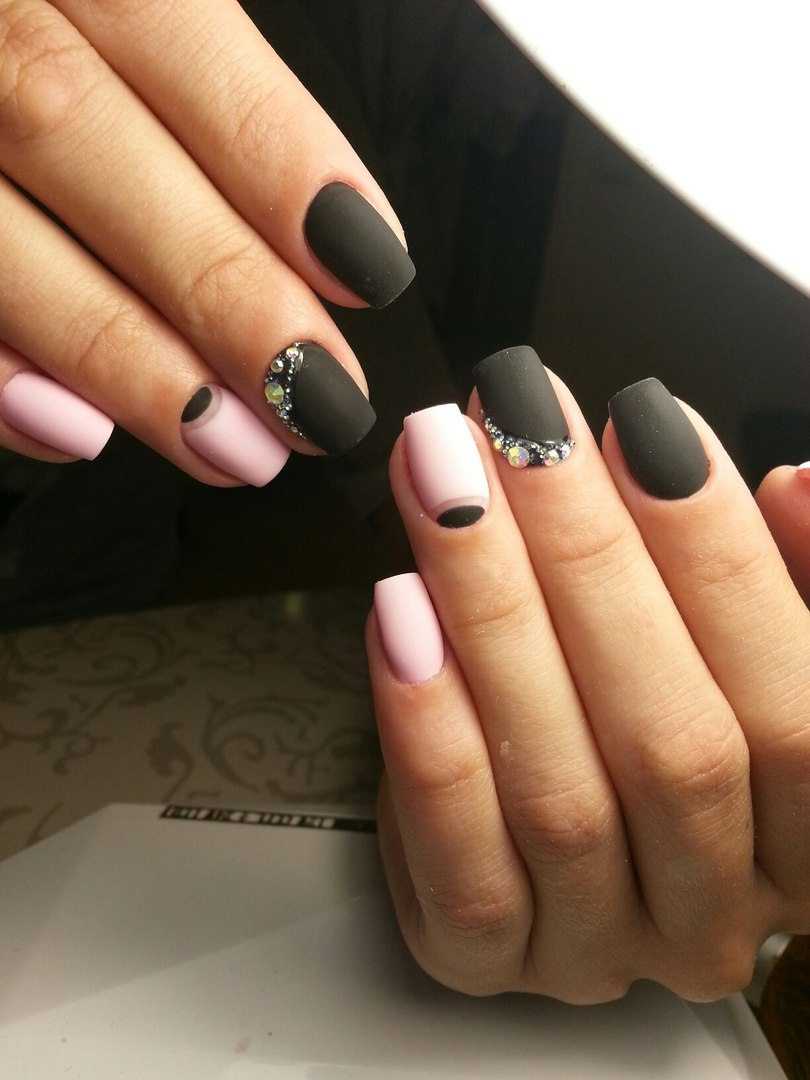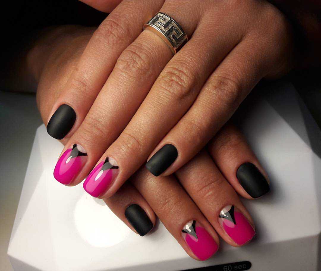 Так как розовый цвет сам по себе достаточно нежный, то он отлично подходит для создания изящного цветочного рисунка на ноготках. Он может быть в минималистичном стиле или наоборот, более крупным, объемным. Чаще всего черный цвет используется в качестве основы. Также иногда мастера добавляют в дизайн еще один нейтральный оттенок, который служит своеобразной подложкой. Дополнительный декор будет к месту, но только в том случае, если он не слишком крупный.