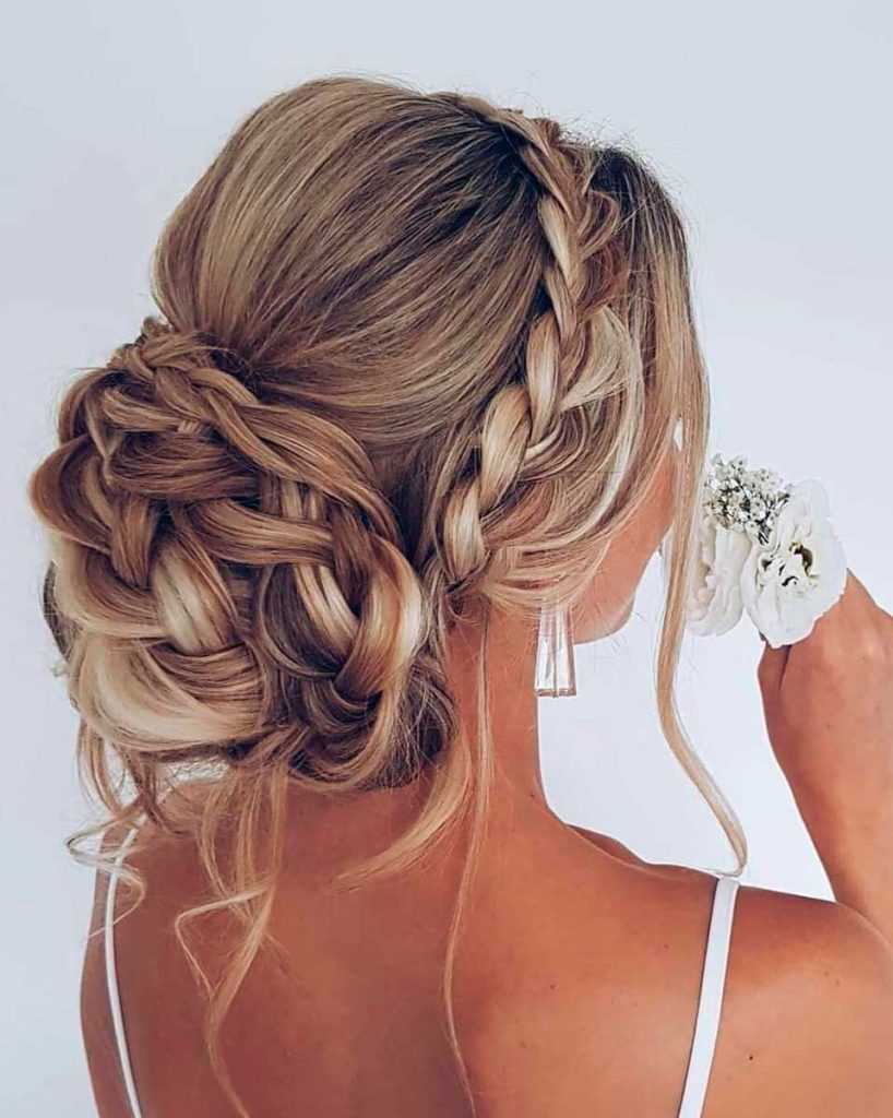 - Расправив плетения, аккуратно уложить, прикрепляя шпильками, косы в пучок.