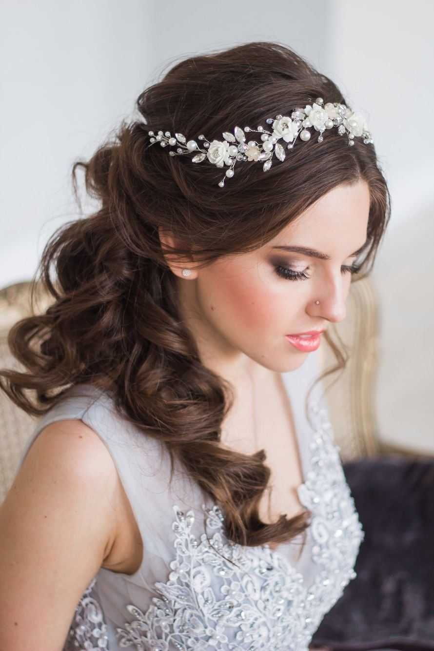 Распущенные волосы, красиво подкрученные и украшенные эффектной заколкой – идеальный вариант для самого главного торжественного события в жизни. Такая свадебная укладка позволит выглядеть очень женственно, а также сместит акцент на праздничный наряд. Варианты оформления распущенных локонов можно рассмотреть на фото: