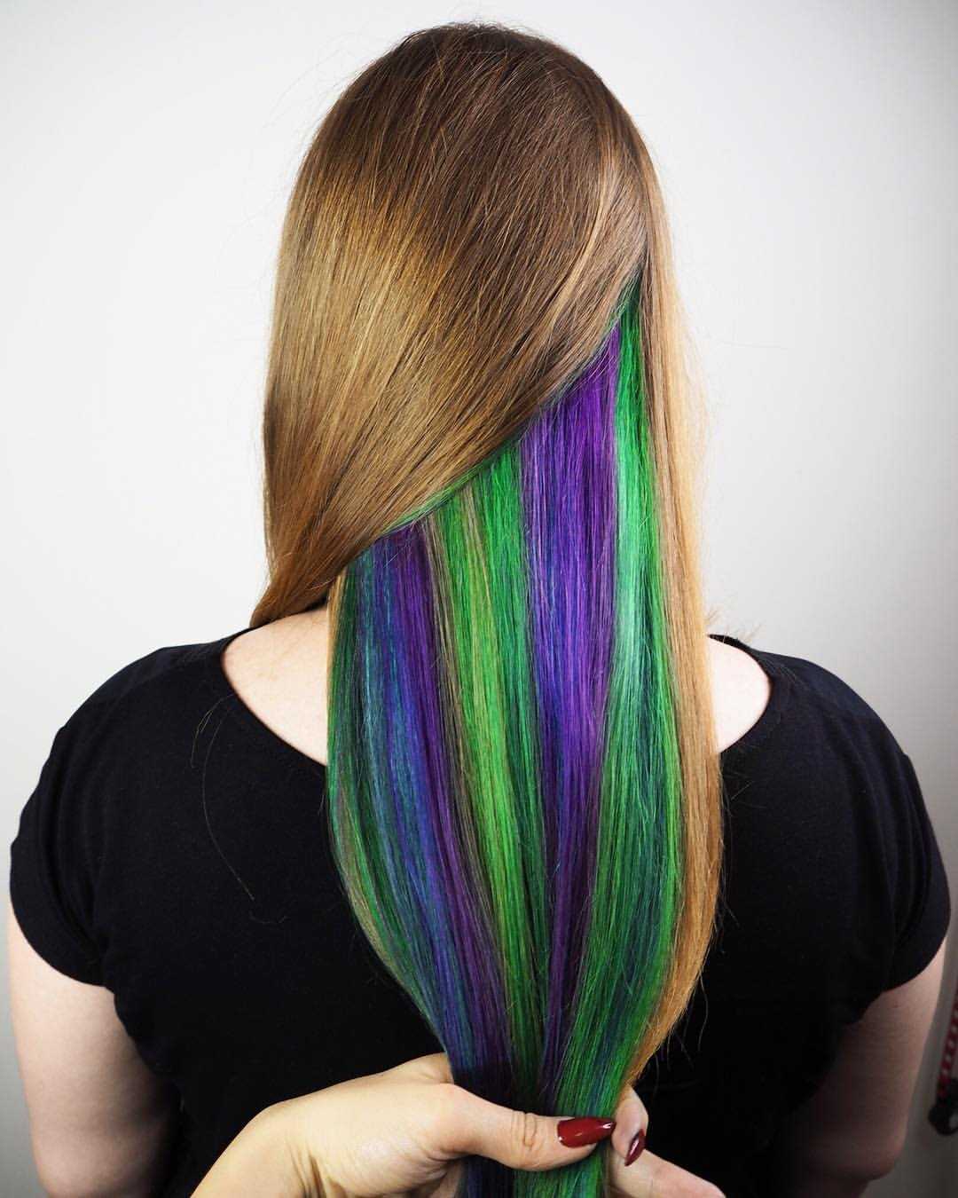 - Футуристические пряди — покрасьте их в яркие цвета, которые создадут «космический» эффект на ваших волосах.