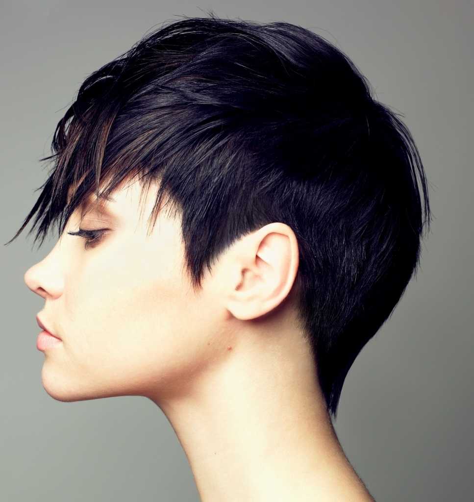Первоначальная вариация характеризуется участками, срезанными на затылке и по бокам. При этом они филируются специальными ножницами. При этом контуры остаются плавными, без четких переходов, даря элегантность смелой моднице. Обязательно украсьте уши серьгами. Подходят как мелкие жемчужинки, так и крупная бижутерия.