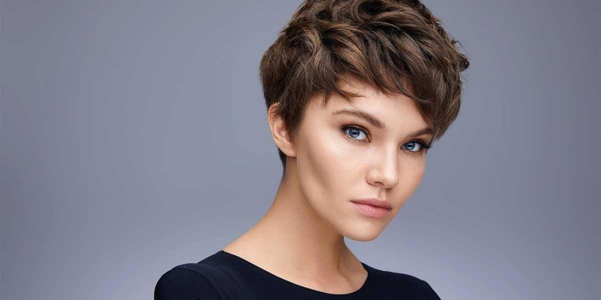 Стрижка «Пикси», короткие кудрявые волосы, лицо круглое
