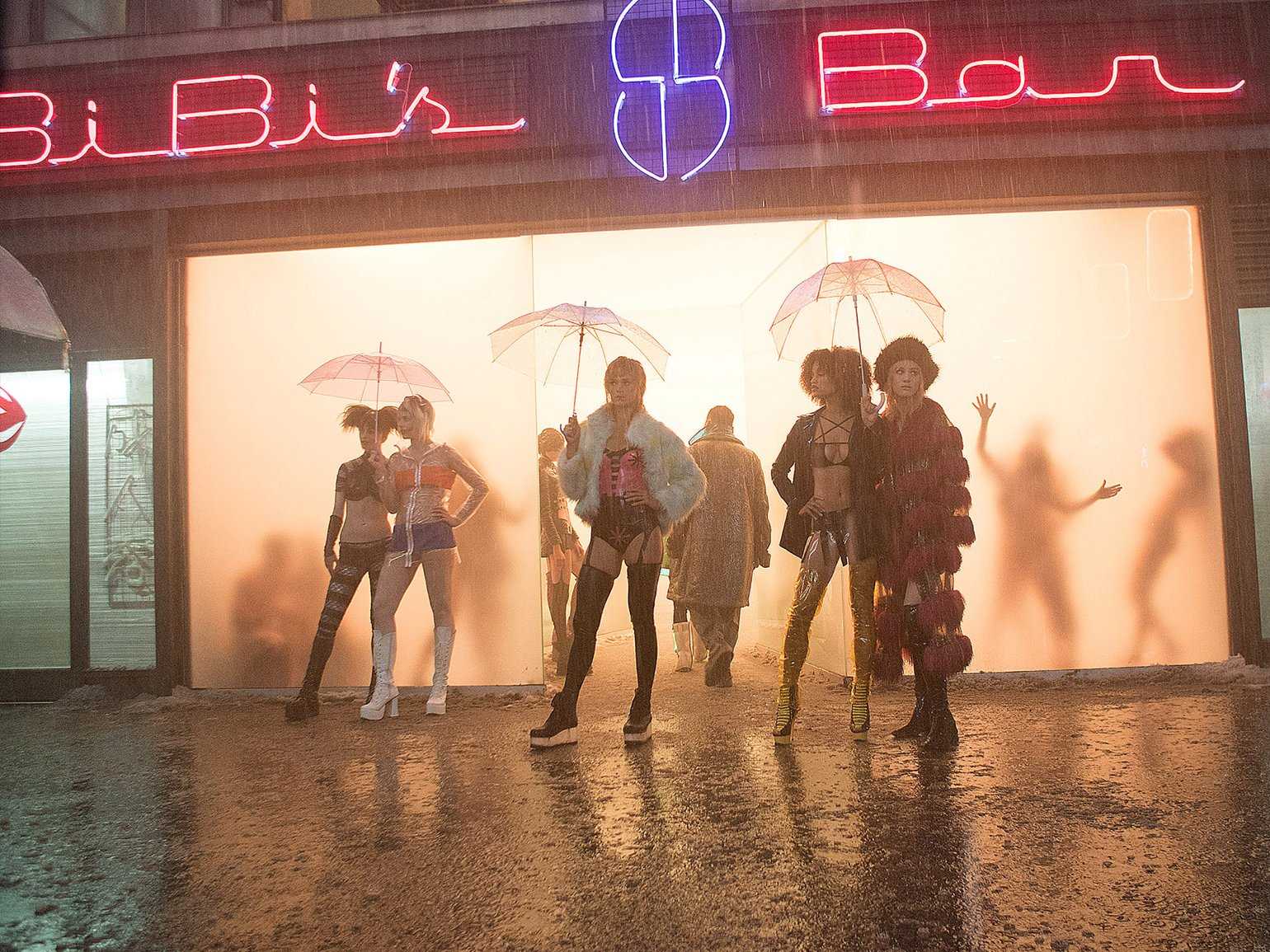 - На атмосферное освещение. В обоих фильмах много неона, он формирует красивую цветовую гамму, подсвечивает лица персонажей, а вместе с постоянным дождём и темнотой создаёт узнаваемую нуарную атмосферу. В работах иллюстраторов подобные приёмы смотрятся очень эффектно.