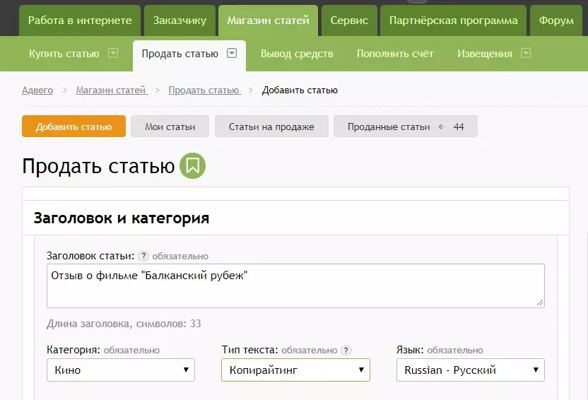 Сначала придумайте цепляющий заголовок, потом выбирайте категорию и тип текста. Ниже идёт форма, в которую необходимо вставить полный текст и выбрать из него небольшой отрезок. Краткий текст увидят покупатели, остальная статья будет закрыта: