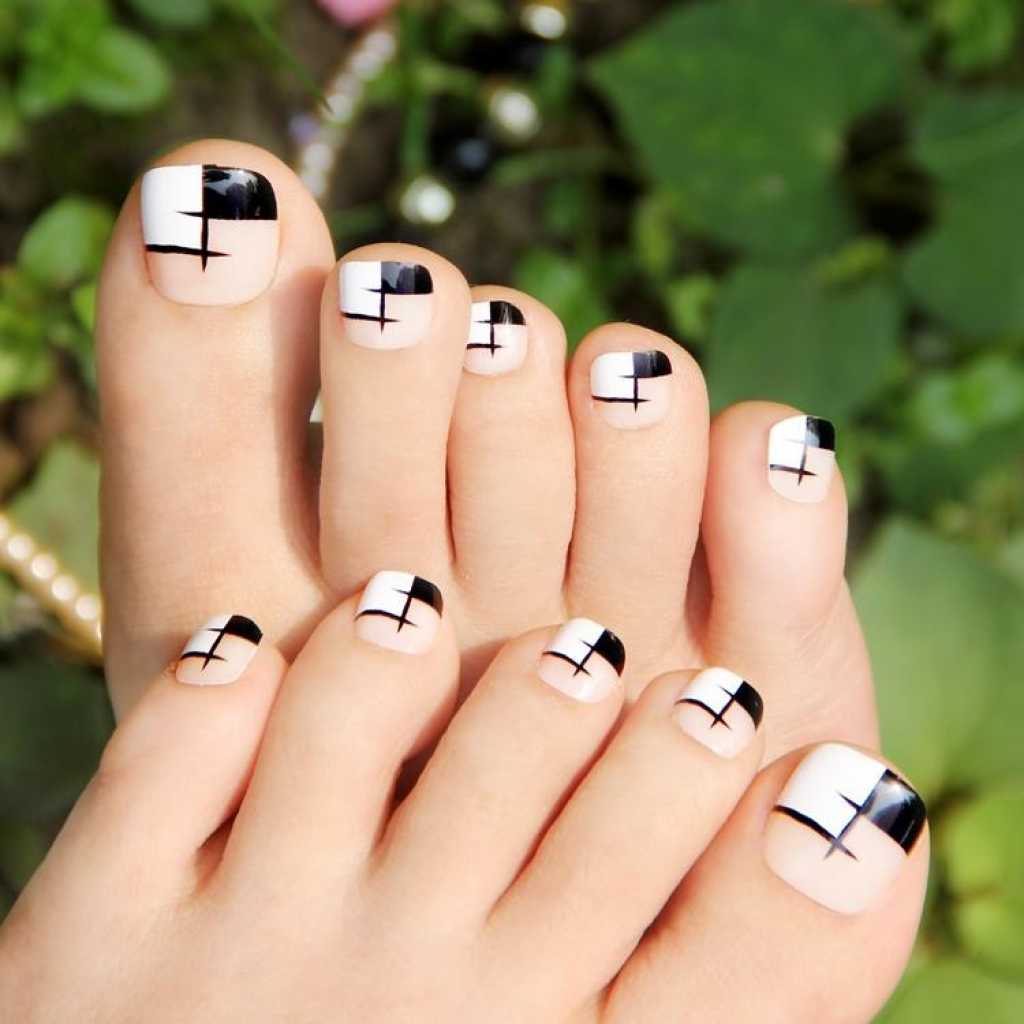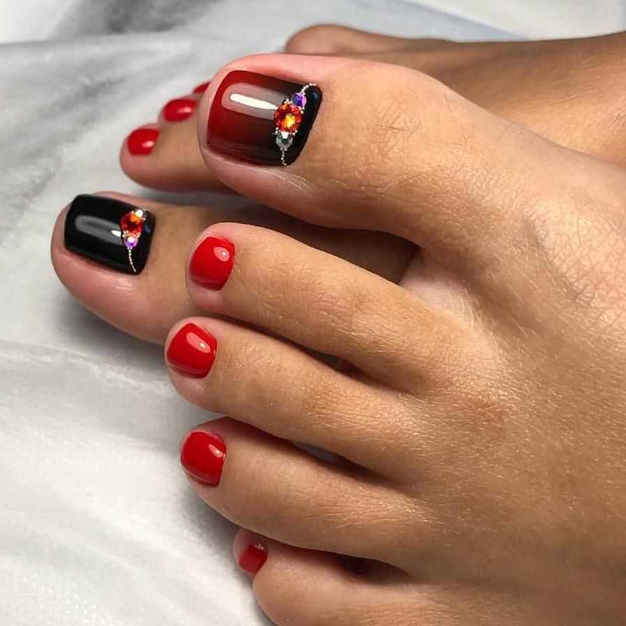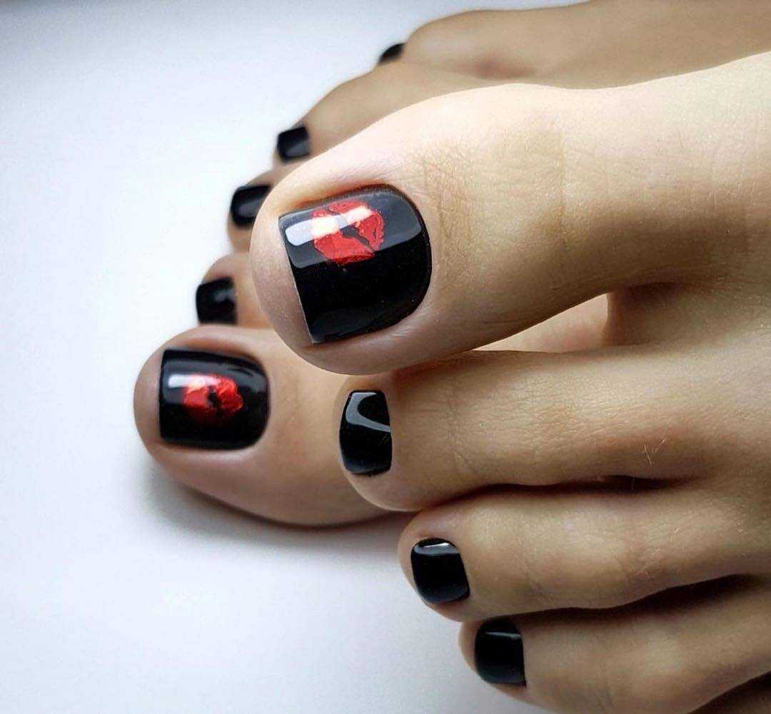 Сочетание черного и красного с успехом используется в маникюре для создания геометрических и других нейл-артов. Тандем этих оттенков действительно выглядит необычно и ярко. Что касается педикюра, то есть несколько вариантов декора ногтей: