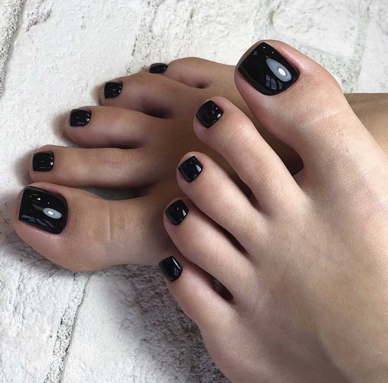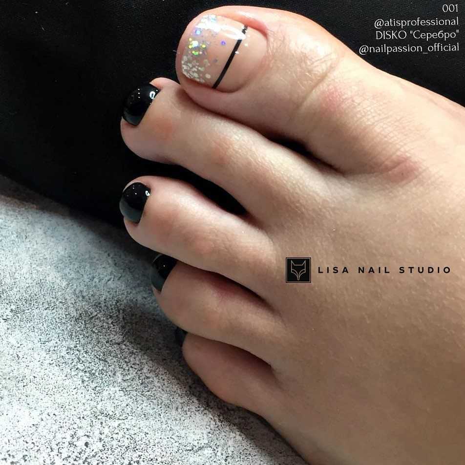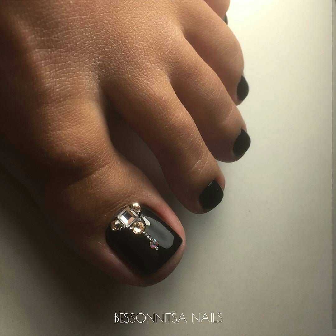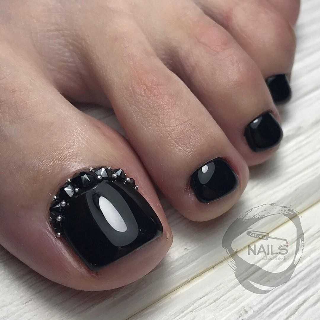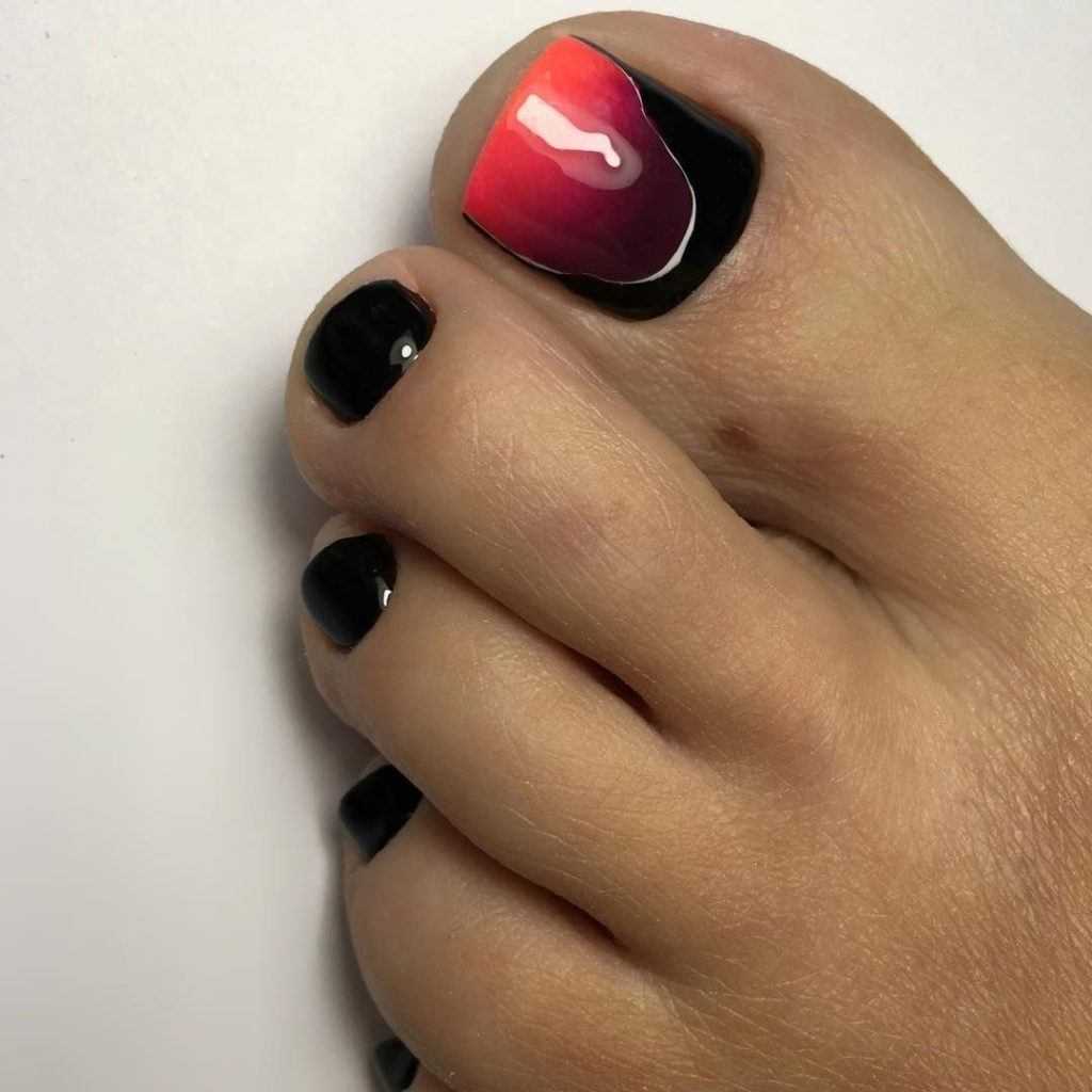 Не стоит размещать на ногтях слишком много дизайна. Так он будет выглядеть дешево и нелепо. Выполните лаконичный дизайн на большом пальце ноги, а остальные ноготки покройте однотонным черным гель-лаком.