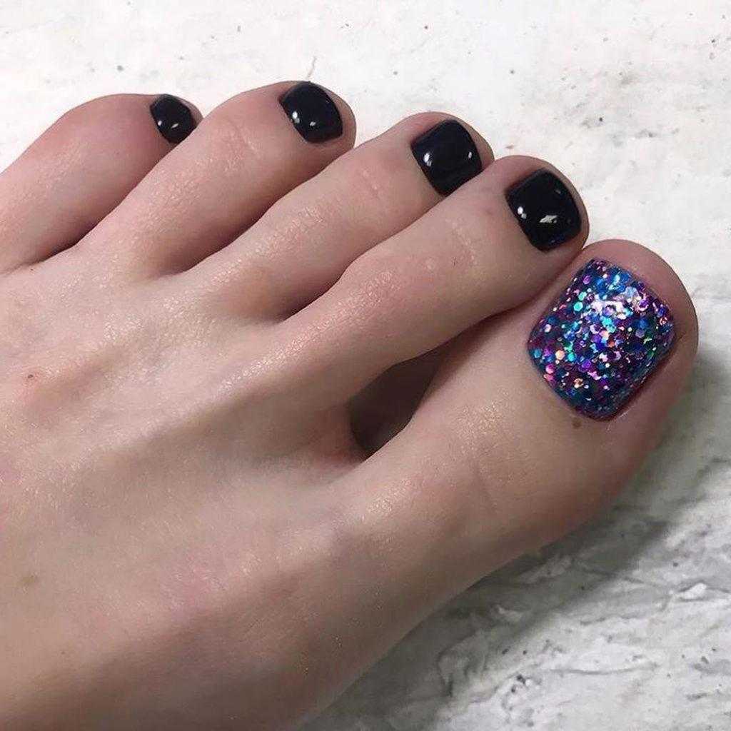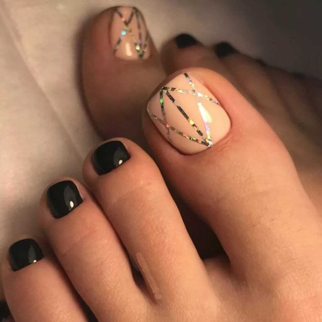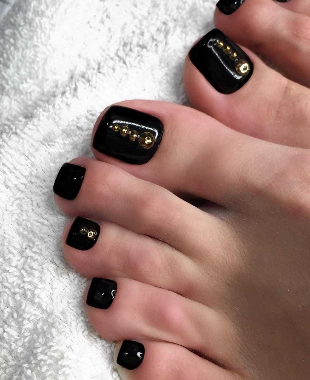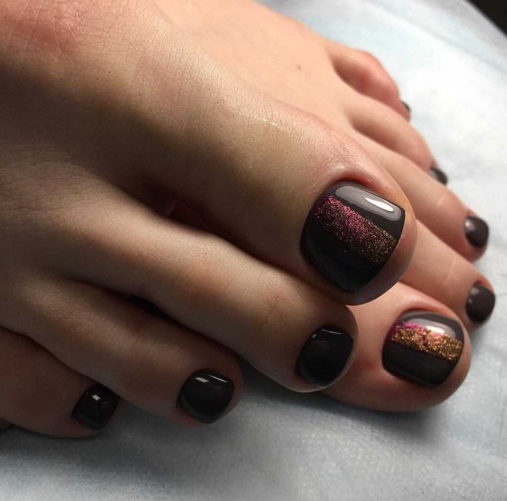 Не стоит размещать на ногтях слишком много дизайна. Так он будет выглядеть дешево и нелепо. Выполните лаконичный дизайн на большом пальце ноги, а остальные ноготки покройте однотонным черным гель-лаком.