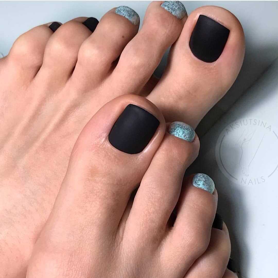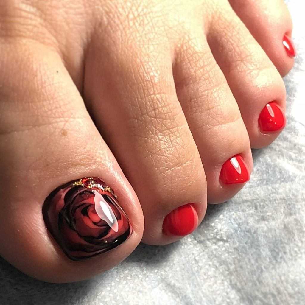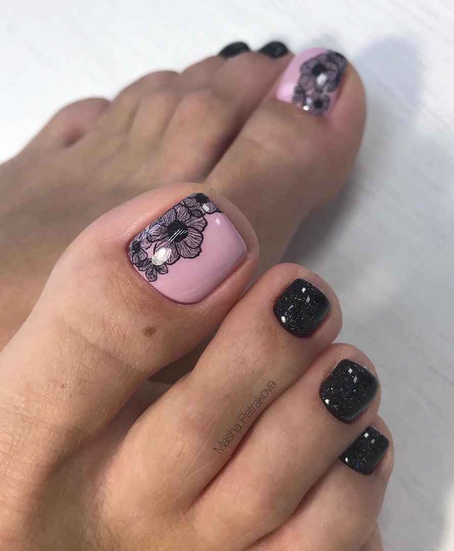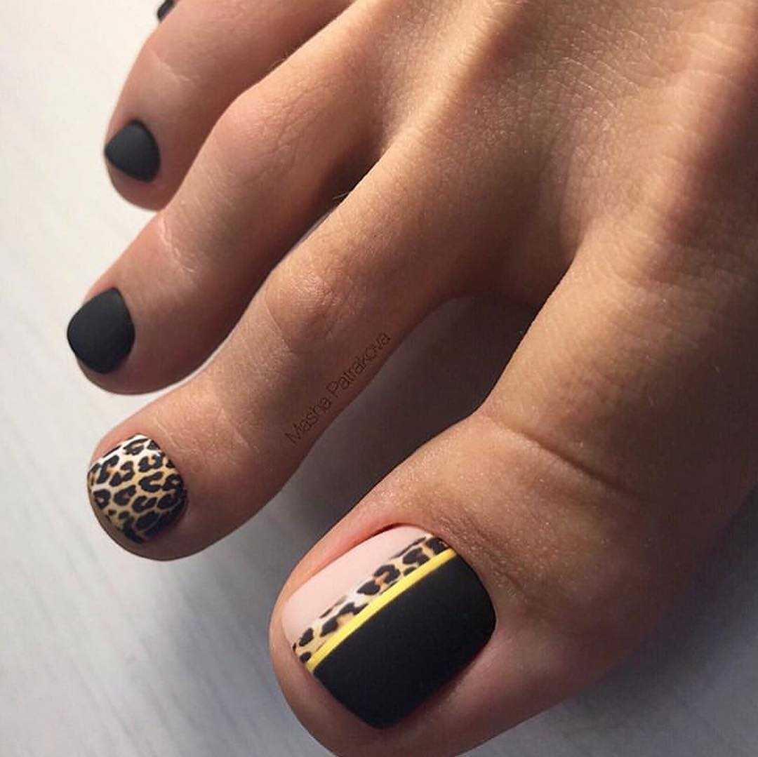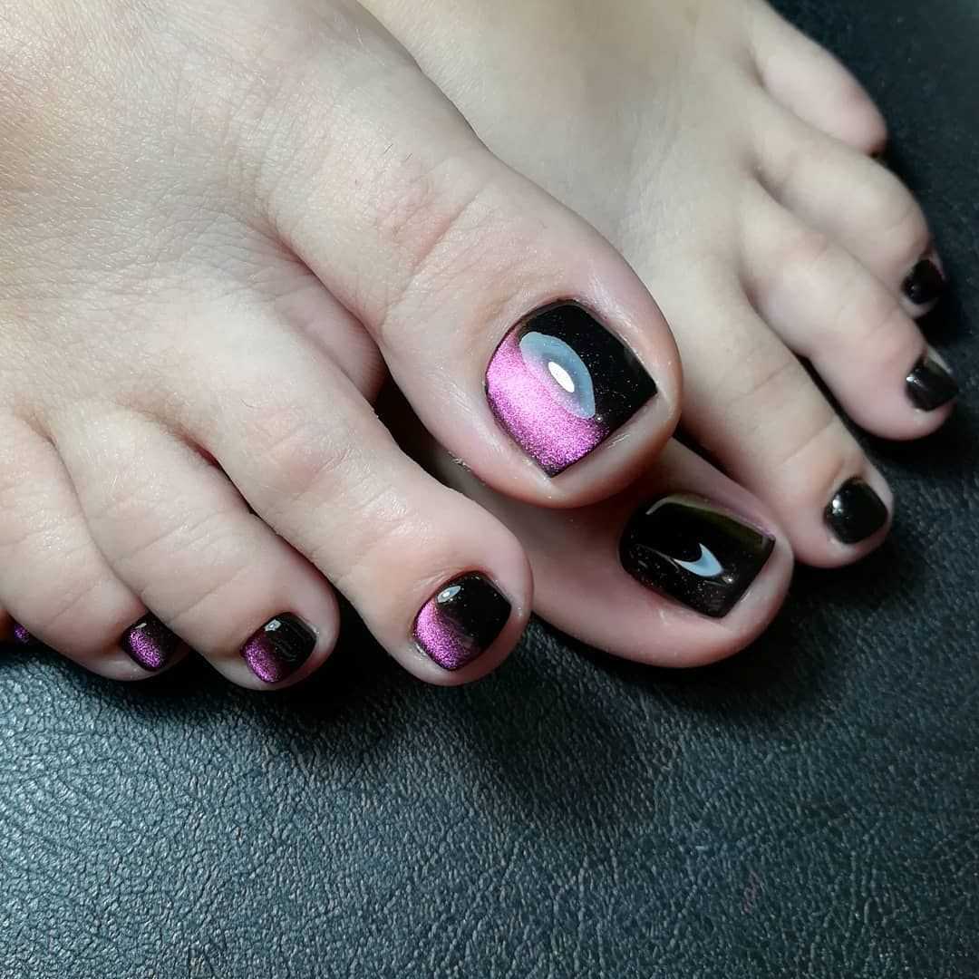 Не стоит размещать на ногтях слишком много дизайна. Так он будет выглядеть дешево и нелепо. Выполните лаконичный дизайн на большом пальце ноги, а остальные ноготки покройте однотонным черным гель-лаком.