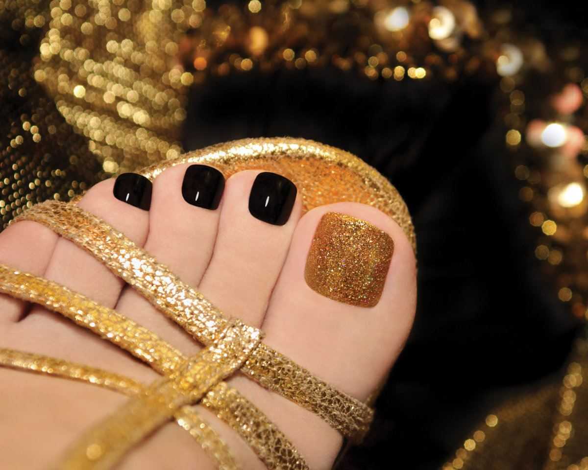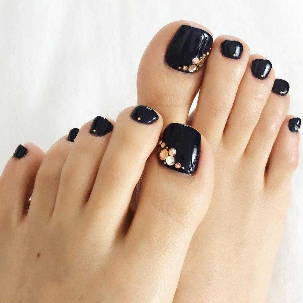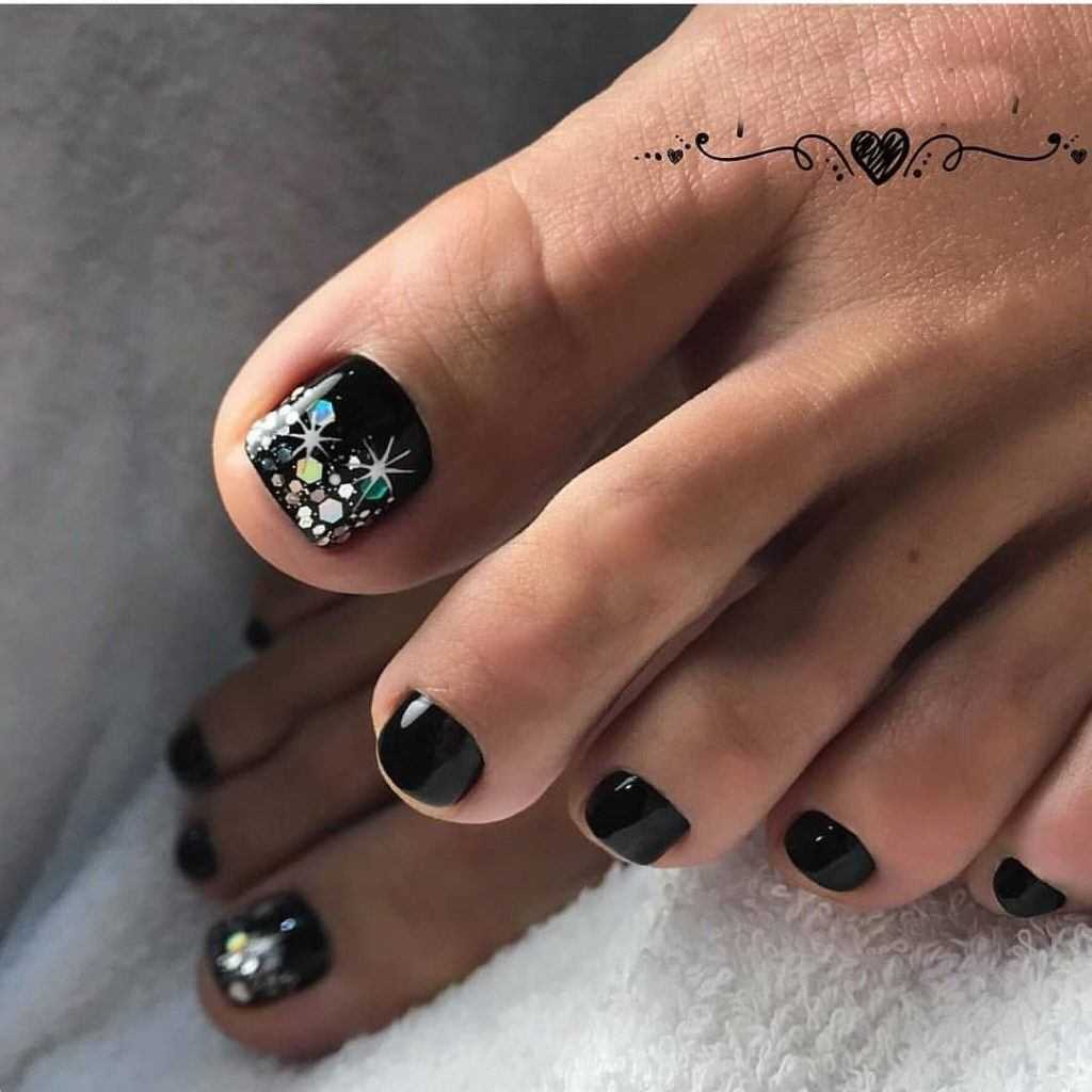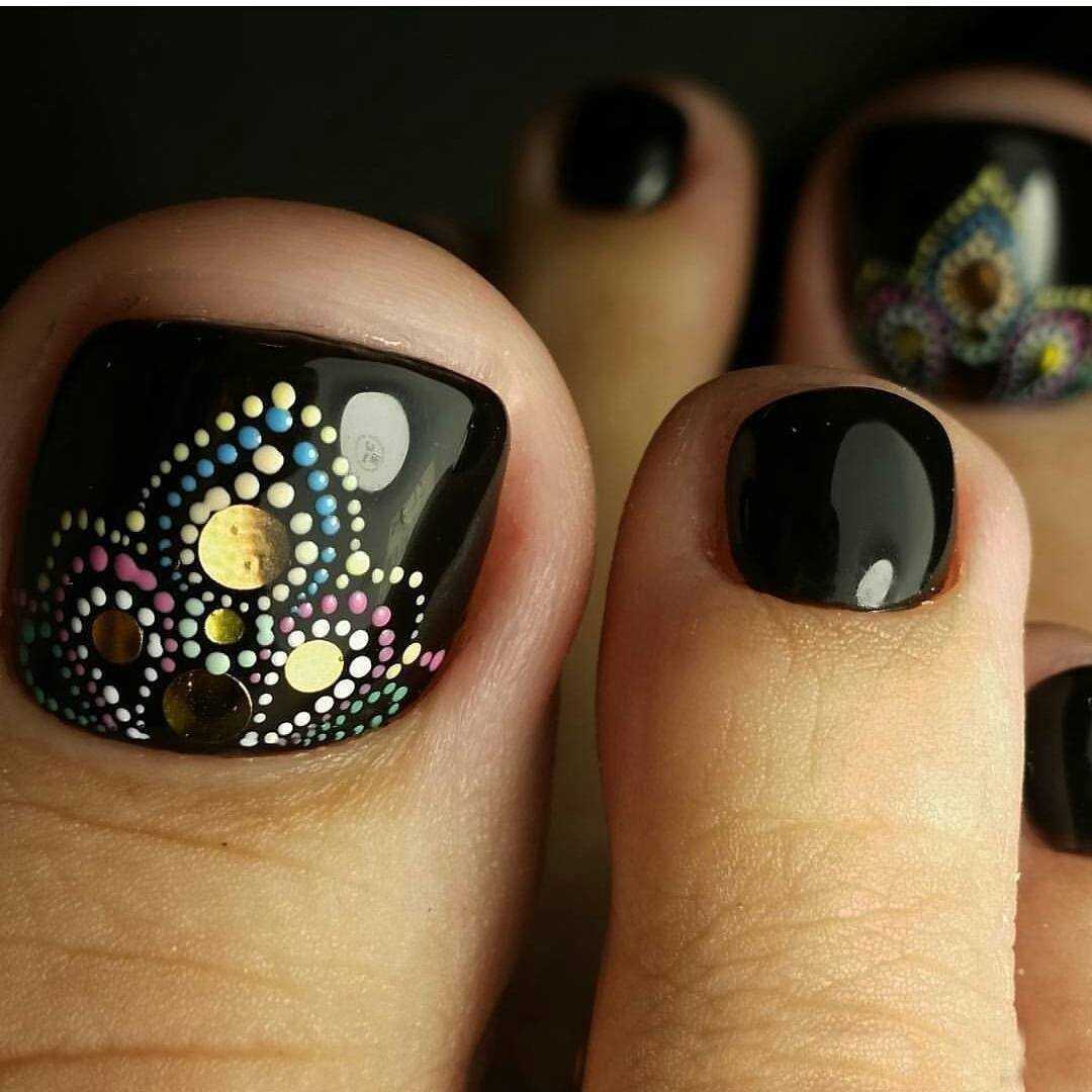 Черный педикюр дает отличную возможность выполнить на своем фоне разнообразные виды дизайна. Тем более что темный оттенок способен подчеркнуть все нужные элементы орнаментов. В качестве дизайна могут быть наклейки, нарисованные клетки, точки, узоры, кубики. Стоит помнить, что большое количество цветовых гамм способно полностью испортить педикюр и придать ему дешёвый вид. К черному лаковому покрытию можно использовать золотые ленты, ведь золото всегда было и будет в тренде. В некоторых случаях мастера педикюра покрывают ноготки матовым покрытием, что придает некую загадку дамским пальчикам.
