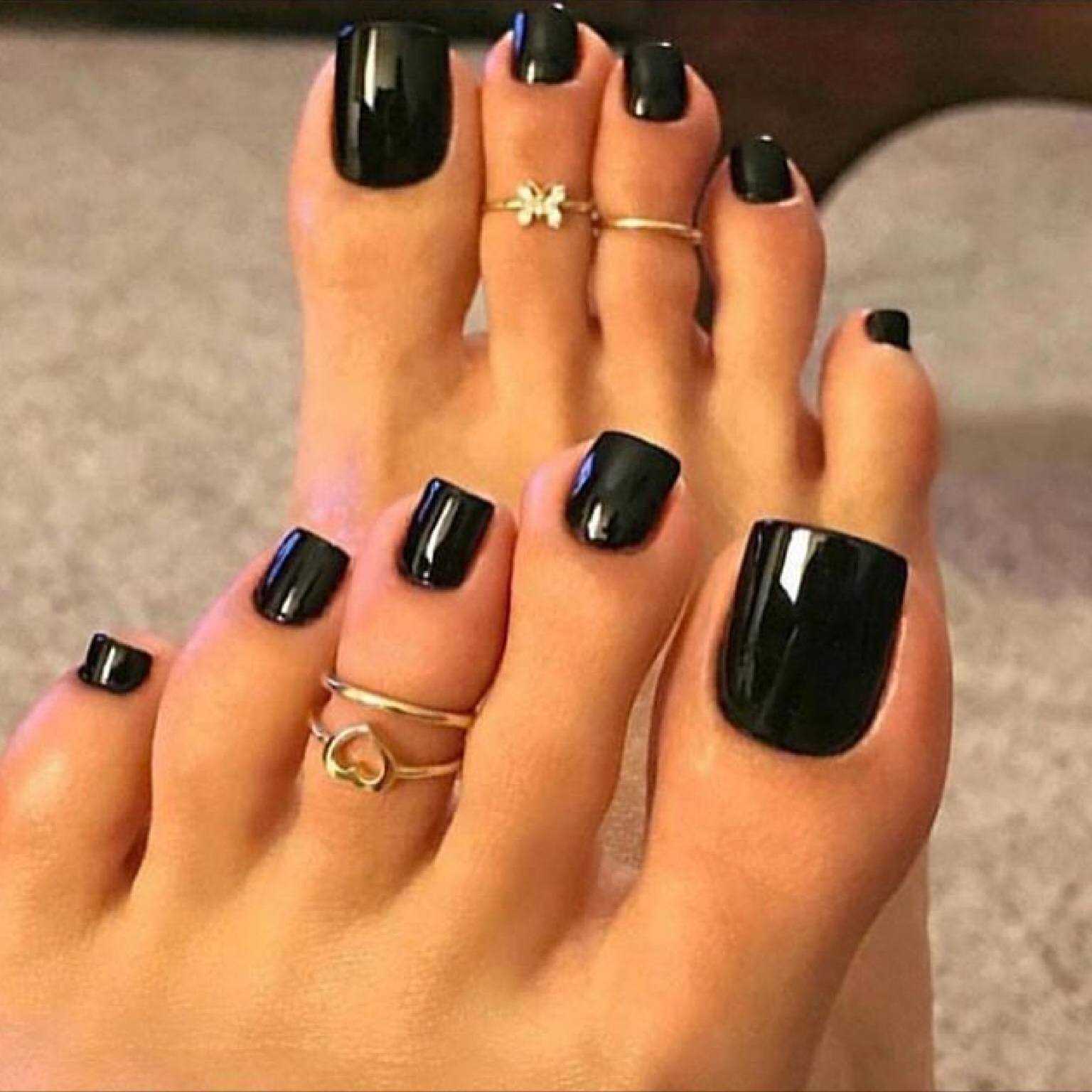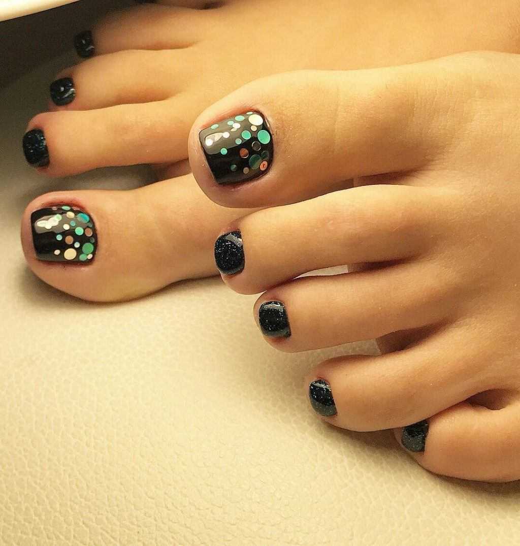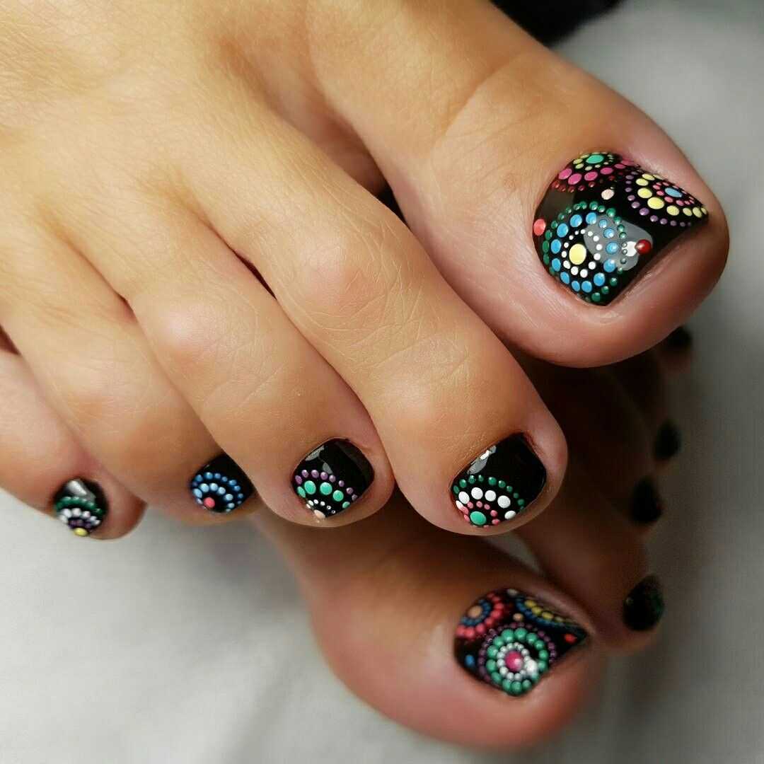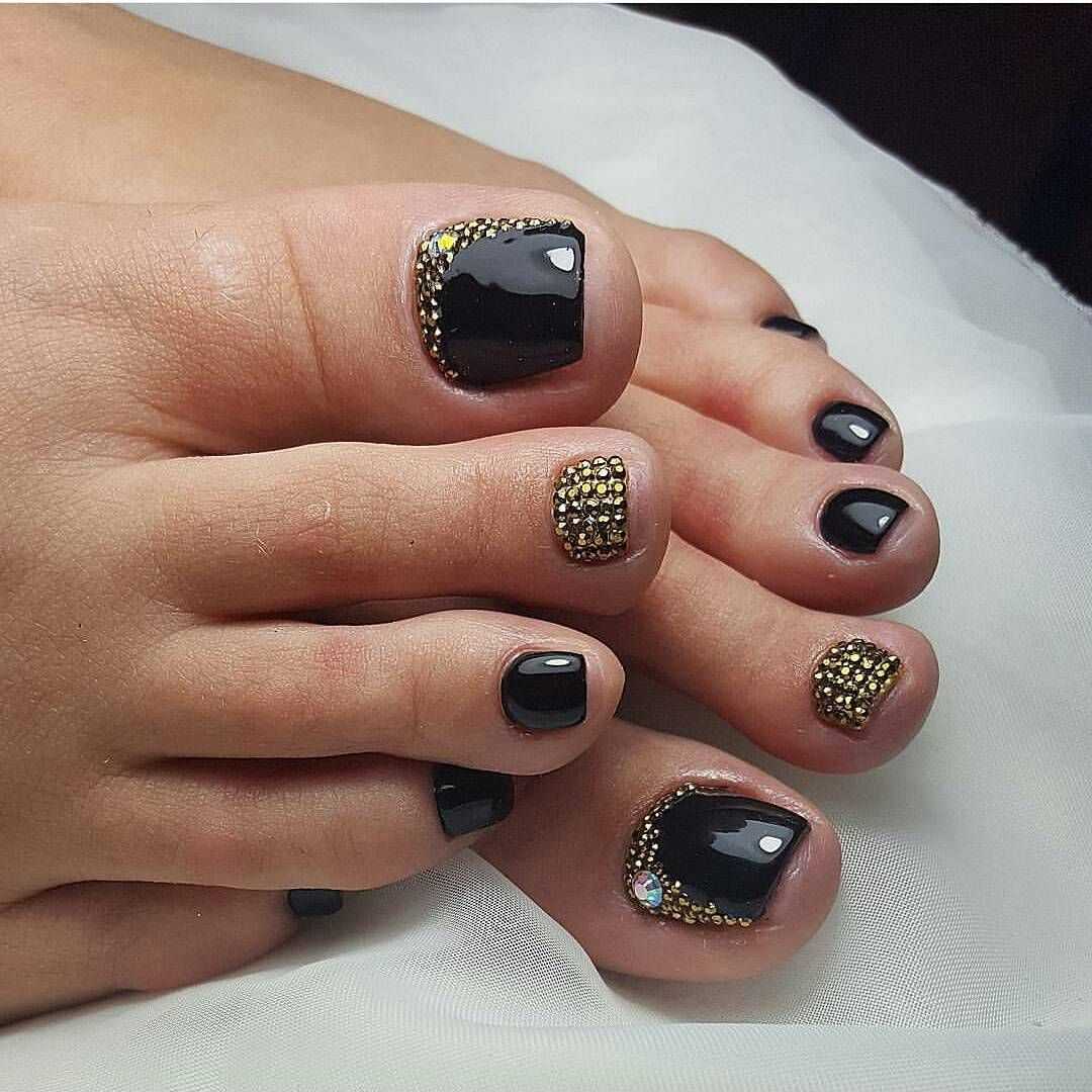 Черный педикюр дает отличную возможность выполнить на своем фоне разнообразные виды дизайна. Тем более что темный оттенок способен подчеркнуть все нужные элементы орнаментов. В качестве дизайна могут быть наклейки, нарисованные клетки, точки, узоры, кубики. Стоит помнить, что большое количество цветовых гамм способно полностью испортить педикюр и придать ему дешёвый вид. К черному лаковому покрытию можно использовать золотые ленты, ведь золото всегда было и будет в тренде. В некоторых случаях мастера педикюра покрывают ноготки матовым покрытием, что придает некую загадку дамским пальчикам.
