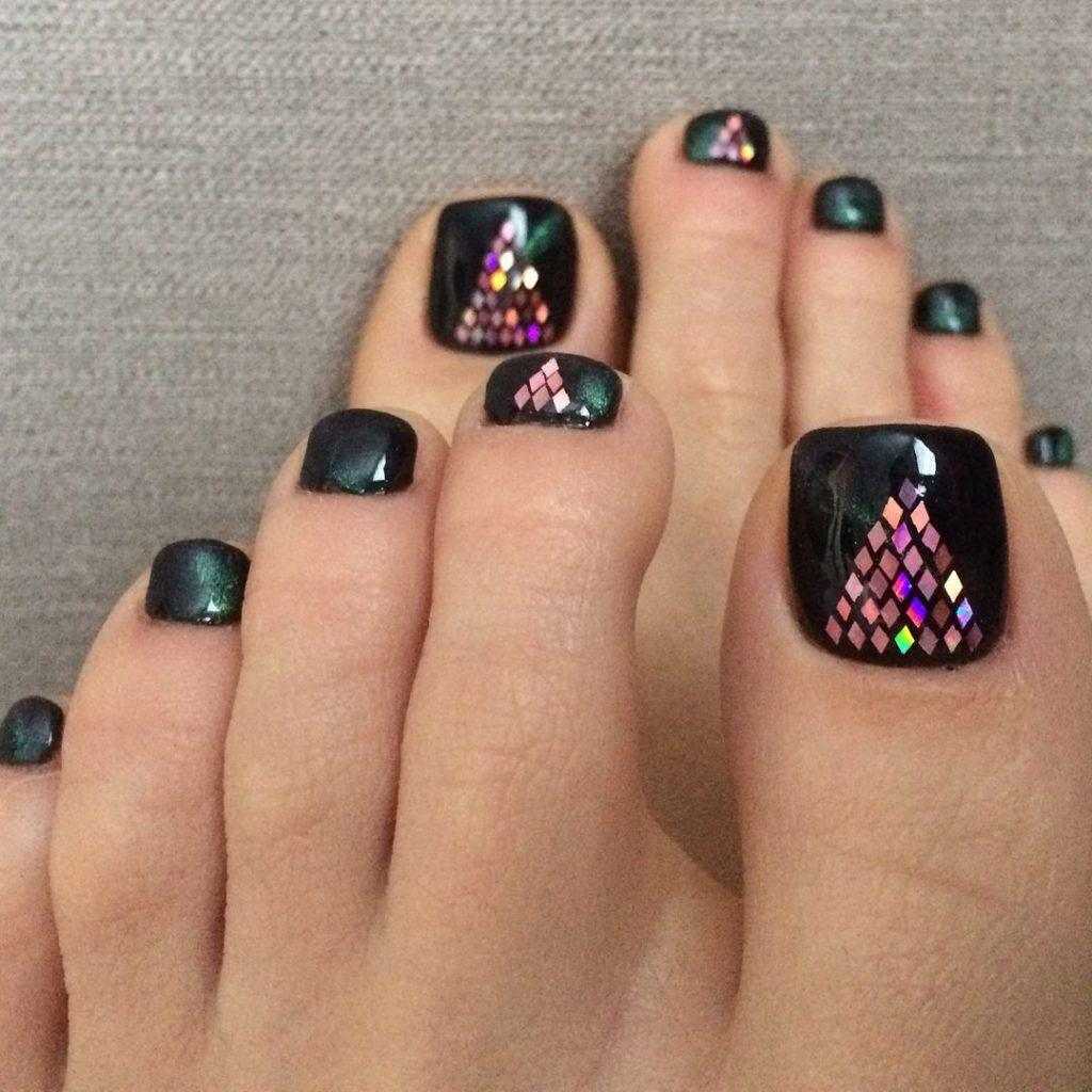 - черный педикюр с красным глиттером – отличное решение для праздничных нейл-артов. Глиттер отлично заменяет стразы, камифубуки и другой блестящий декор.