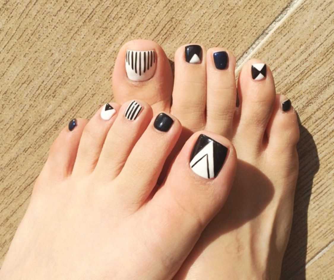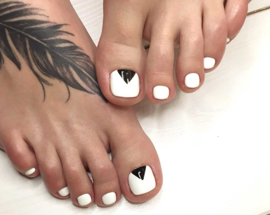 2020 год радует всех женщин своими новинками и трендами. Эти новинки не обошли и педикюр. Трендом года стал черный педикюр, в сочетании с которым используют различные цветовые оттенки. К примеру, ноготь большого пальца покрывают бежевым или красным цветом лакового покрытия, а у основания ногтя делают лунку черного цвета. Остальные ноготки покрываются черным лаком. Также модно в 2020 году делать черный педикюр, где на большом пальце сделана ограничительная линия соединений синего и черного. Синим цветом можно заполнить безымянный ноготок. Линию в основном делают белым или серебристым покрытием. Но самым оригинальным и популярным стал вариант дизайна, выполненный в стиле геометрических фигур. Данный орнамент находится на ноготке большого пальца, так как там больше места для рисунка. Из белого, черного и бежевого лака или красок рисуются треугольники, расположенные в хаотическом порядке. Остальные ногти покрываются черным цветом.
