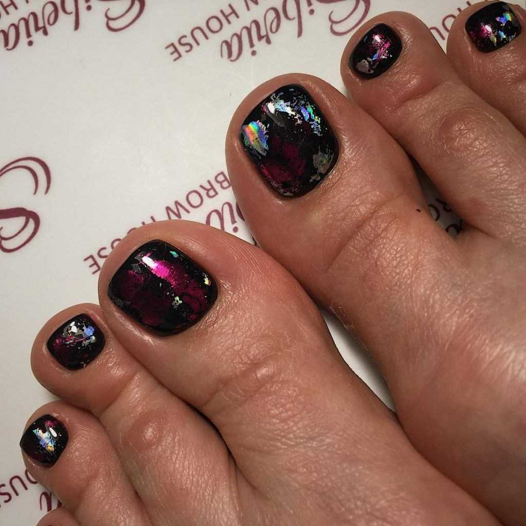 Фольга отлично смотрится на темной матовой поверхности. Выполняйте оттиск фольгой на большом пальце, а остальные покройте однотонным слоем гель-лака. Дизайн с фольгой не нуждается в дополнительном декоре. В педикюре такое дополнение будет лишним, так как ограниченное пространство ногтевой пластины не всегда позволяет это сделать.