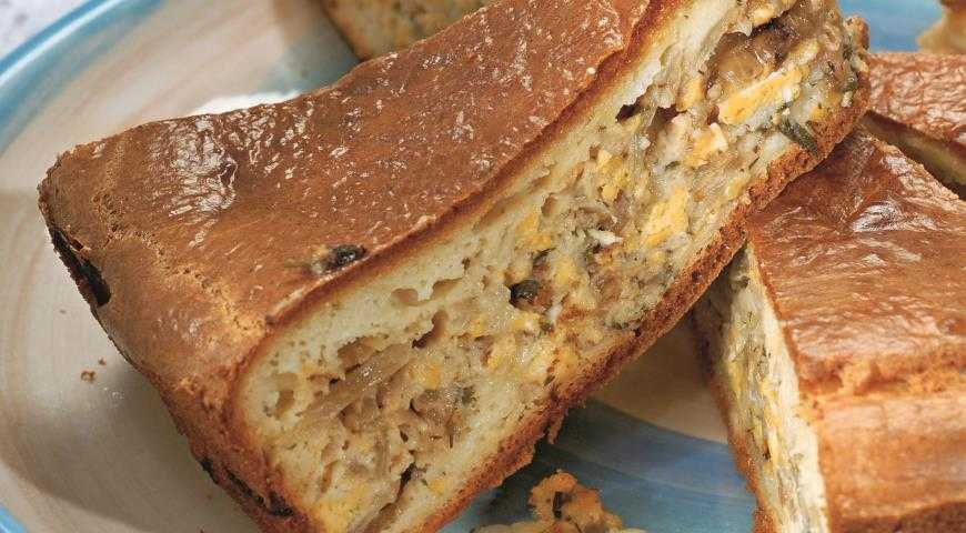 Всыпьте просеянную муку, замесите тесто. Половину теста вылейте в застеленную пергаментом форму. Сверху выложите начинку и залейте оставшимся тестом. Выпекайте 30 минут при 200 °С.