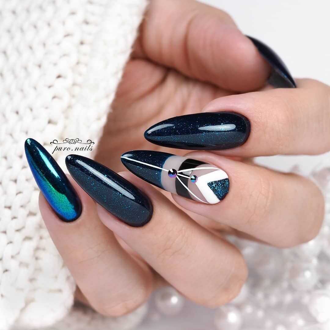 Что касается темных оттенков, то тут стоит быть осторожнее. Не рекомендуется покрывать однотонным черным гель-лаком длинные ногти стилеты, квадратные ногти. Если вы все же решили использовать темный оттенок в качестве основного, то дополняйте его геометрическим декором, серебряным глиттером, слайдерами.