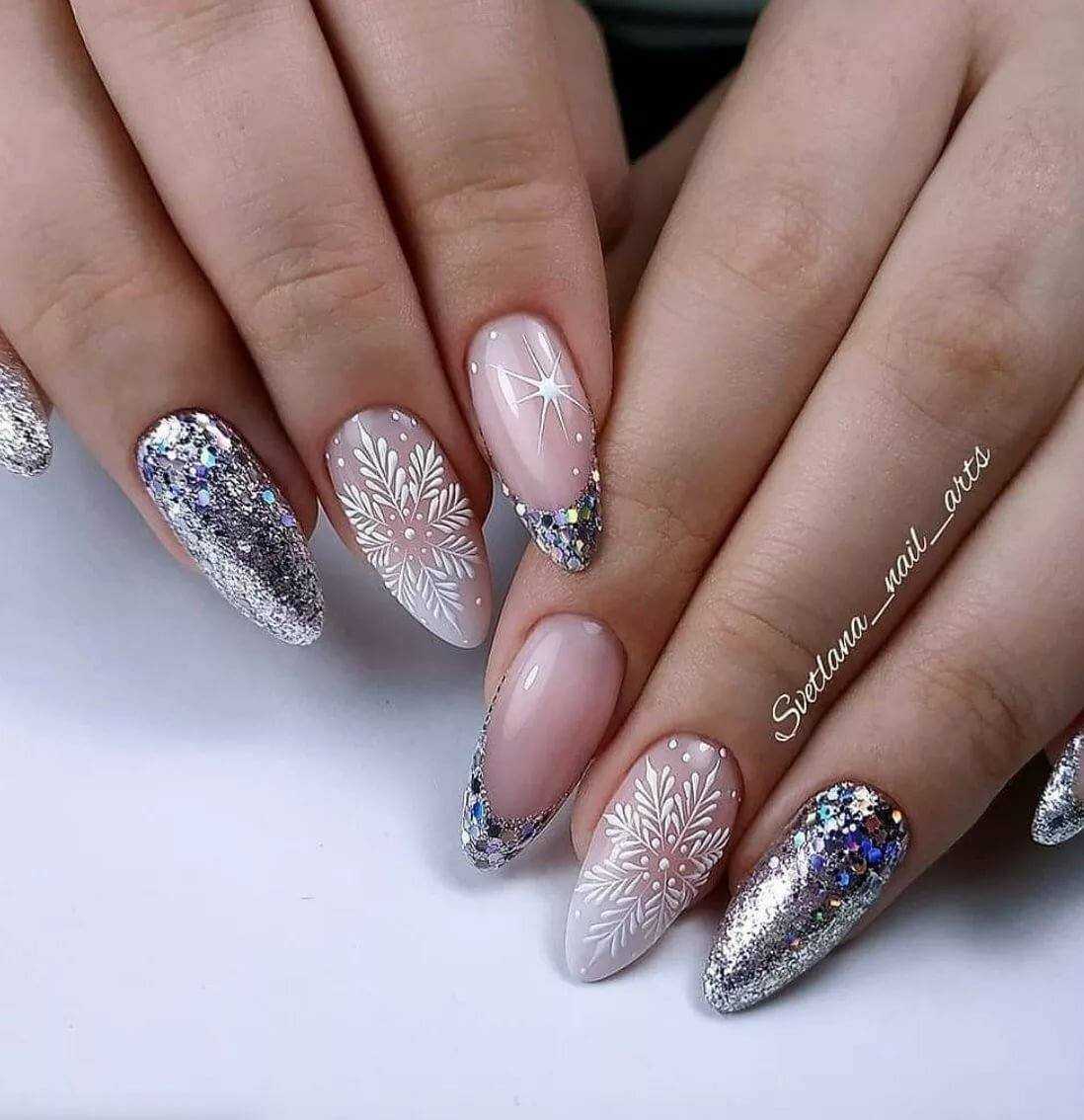 Еще одна симпатичная вариация новогоднего дизайна для любителей ню. Добавьте к обычной тени немного блесток и нарисуйте маленькие звездочки или снежинки. Очень элегантно и романтично!