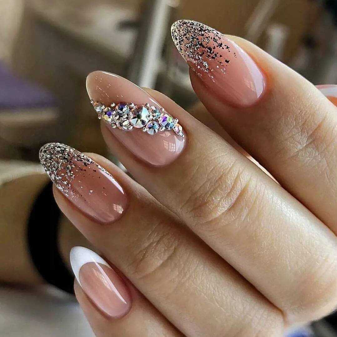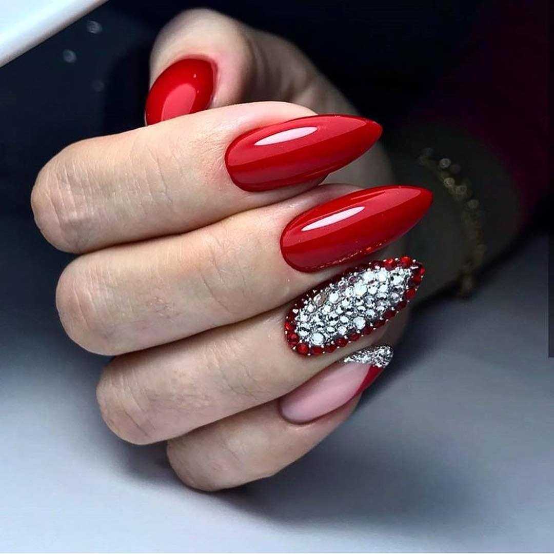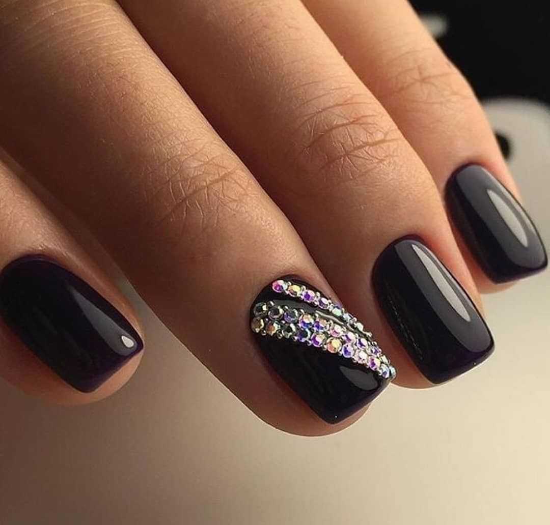 Море блесток, конечно же, станет идеальным вариантом для праздничного маникюра. Стразы могут быть совершенно разного размера и разного оттенка. Выложить их можно в интересную композицию, или же рассыпать в хаотичном порядке.