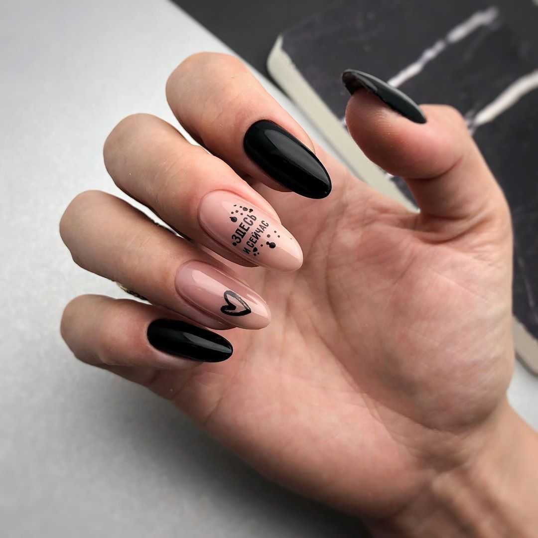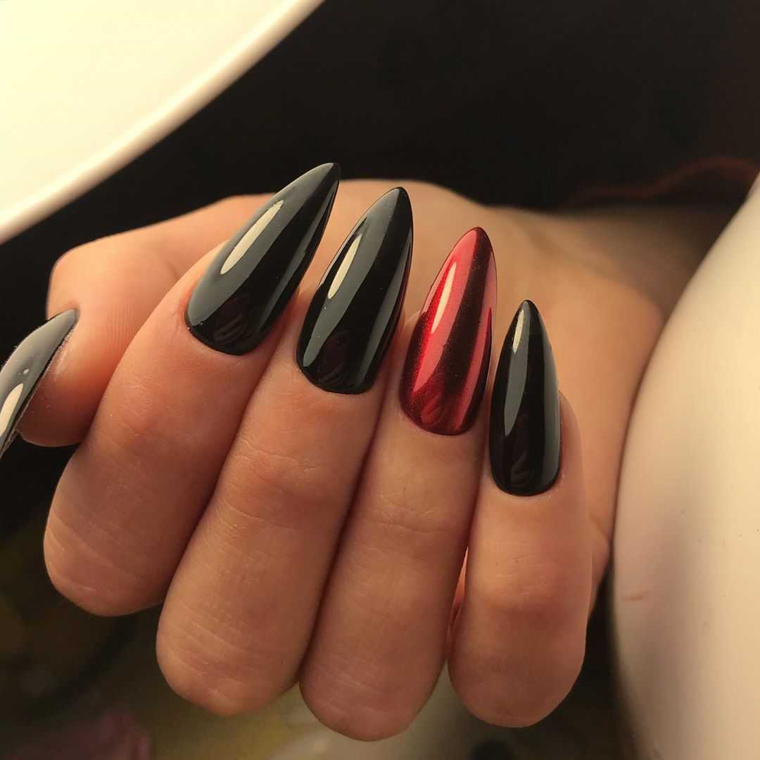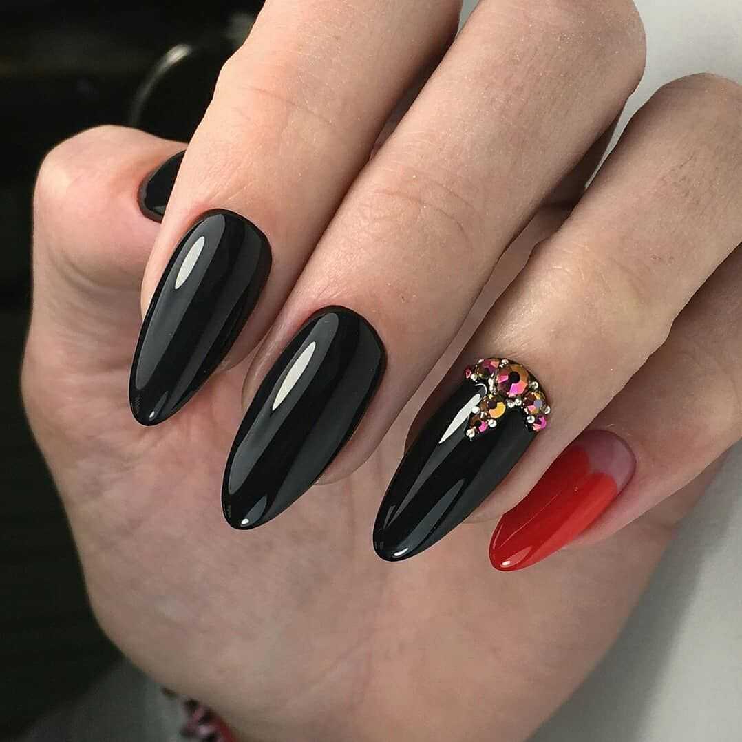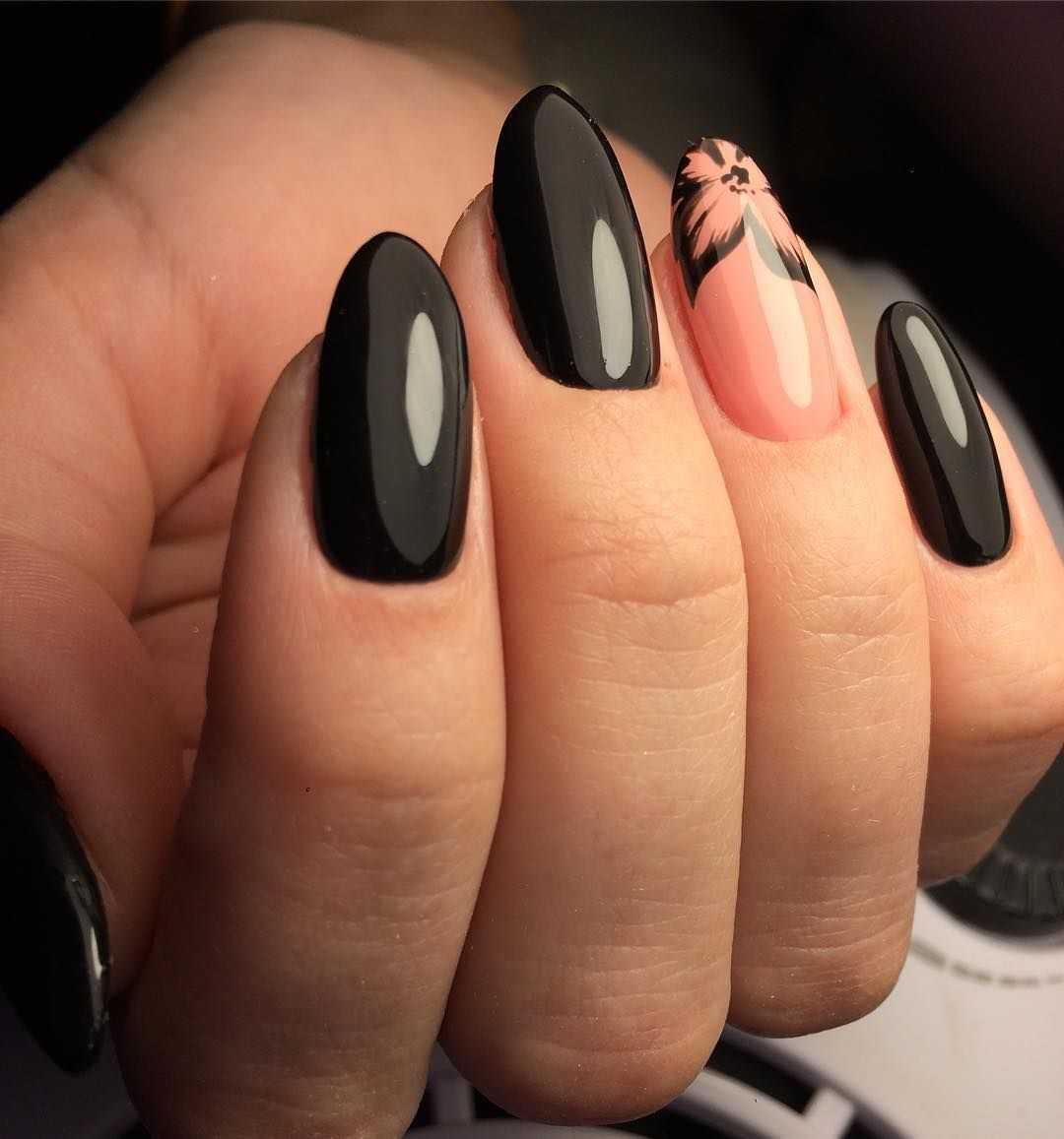 Черный маникюр великолепно смотрится на длинных миндальных и квадратных ногтях