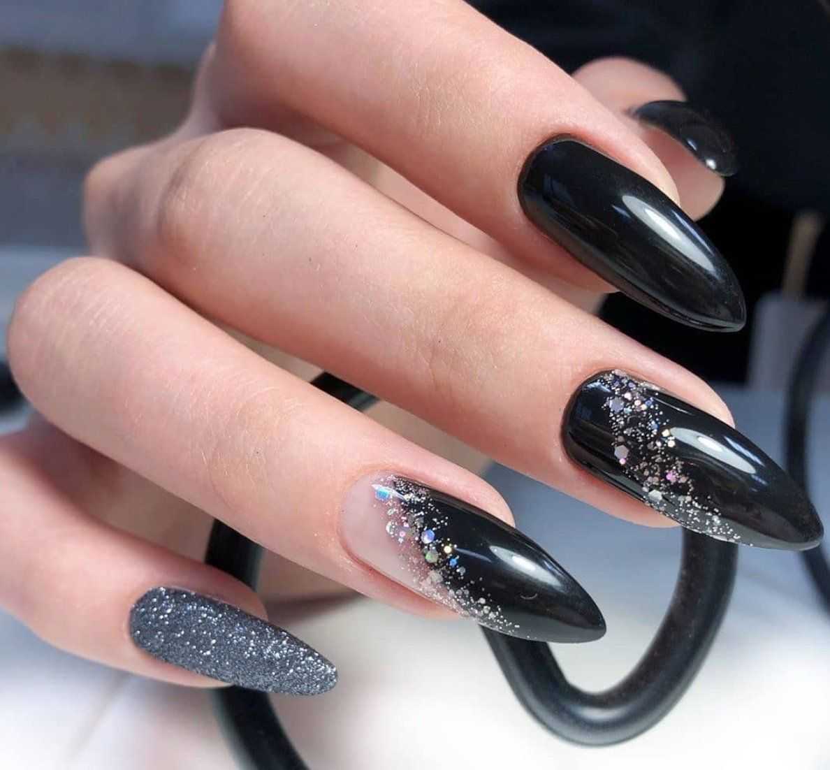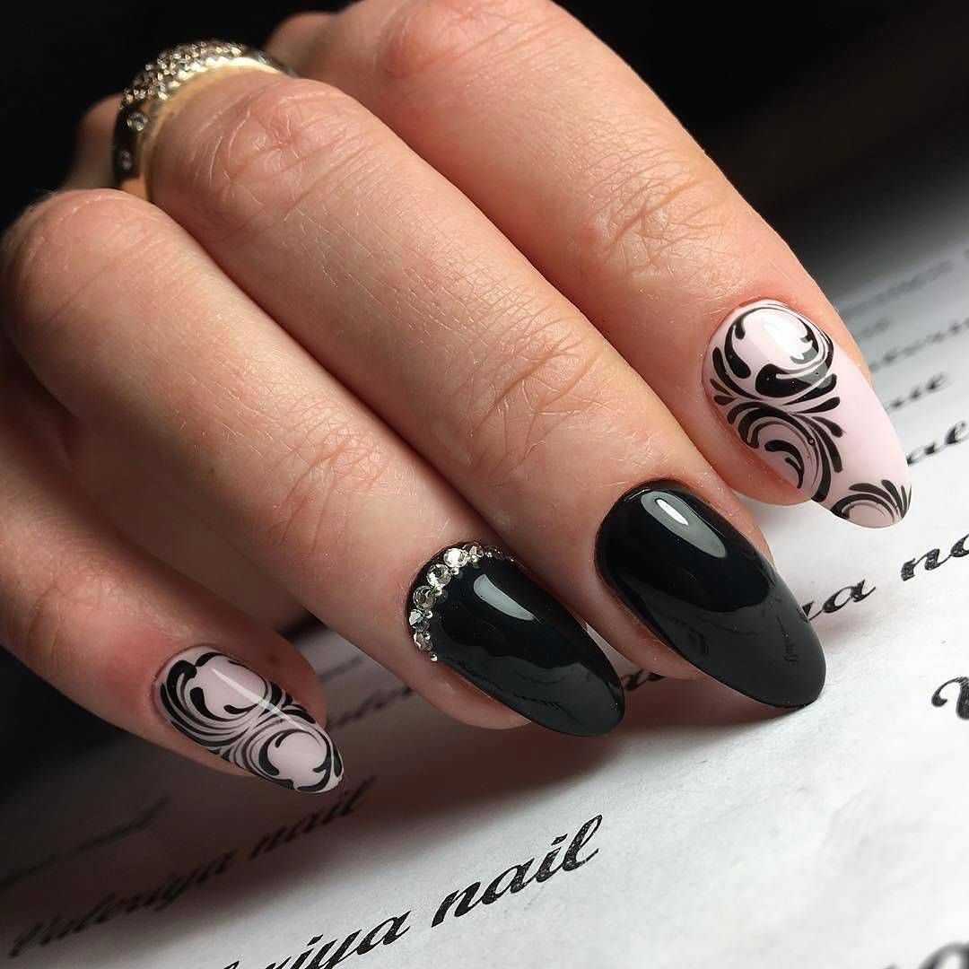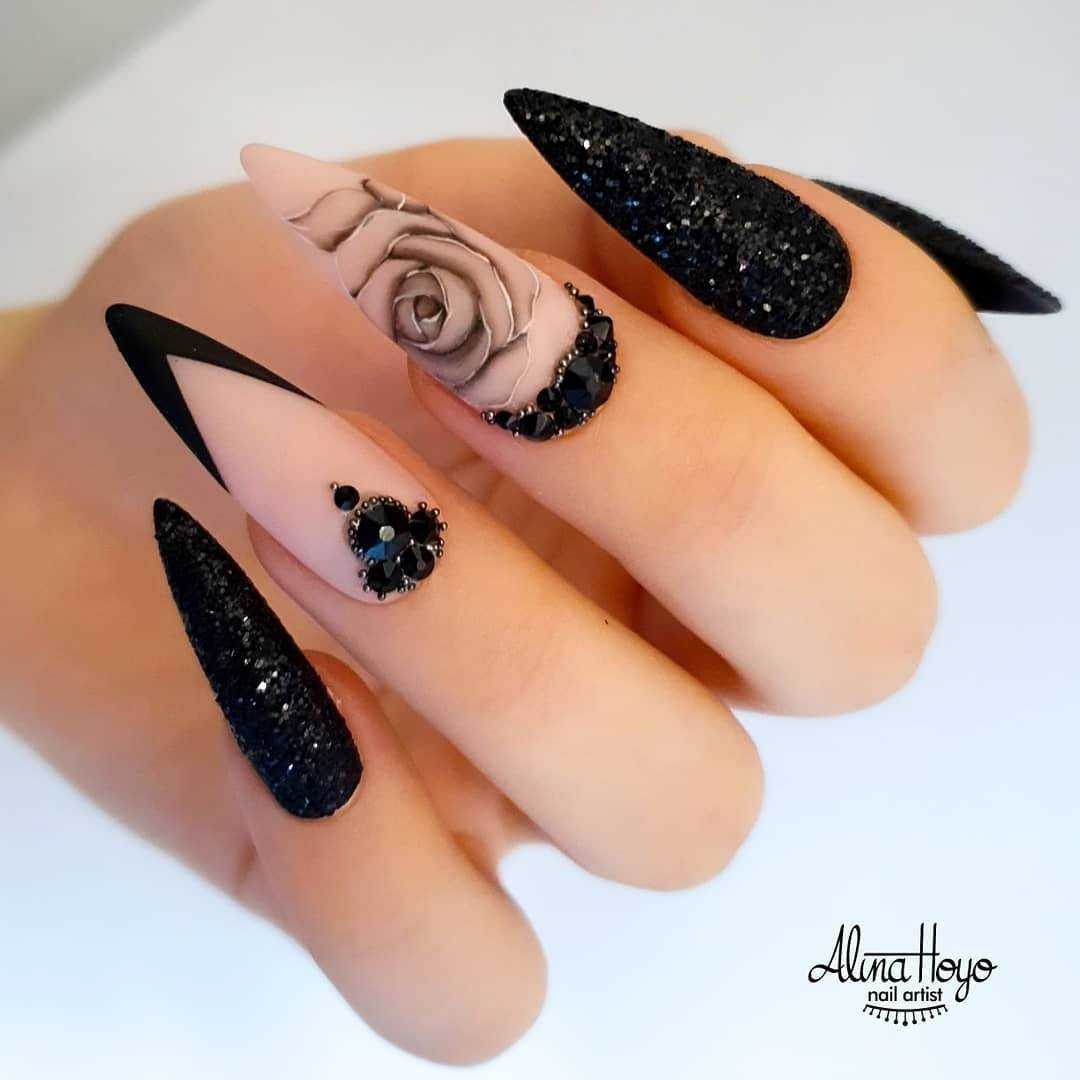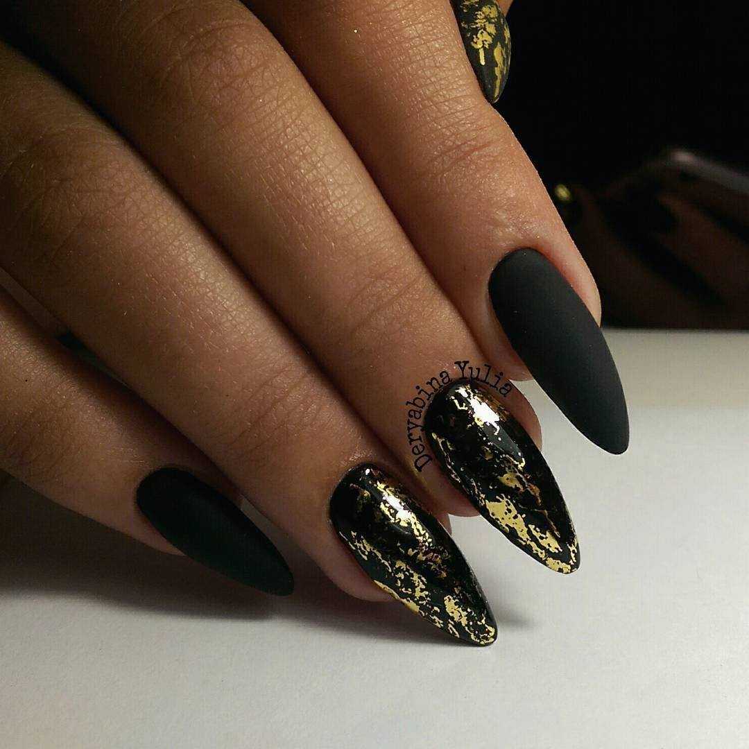 Черный маникюр великолепно смотрится на длинных миндальных и квадратных ногтях