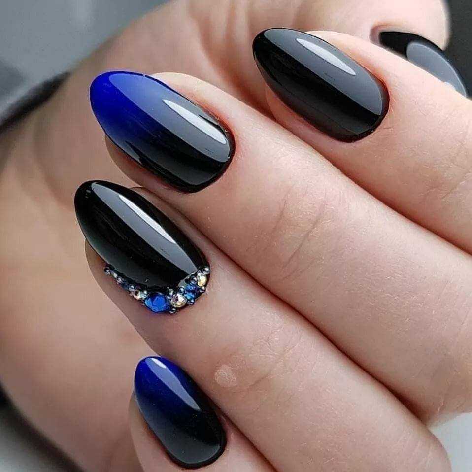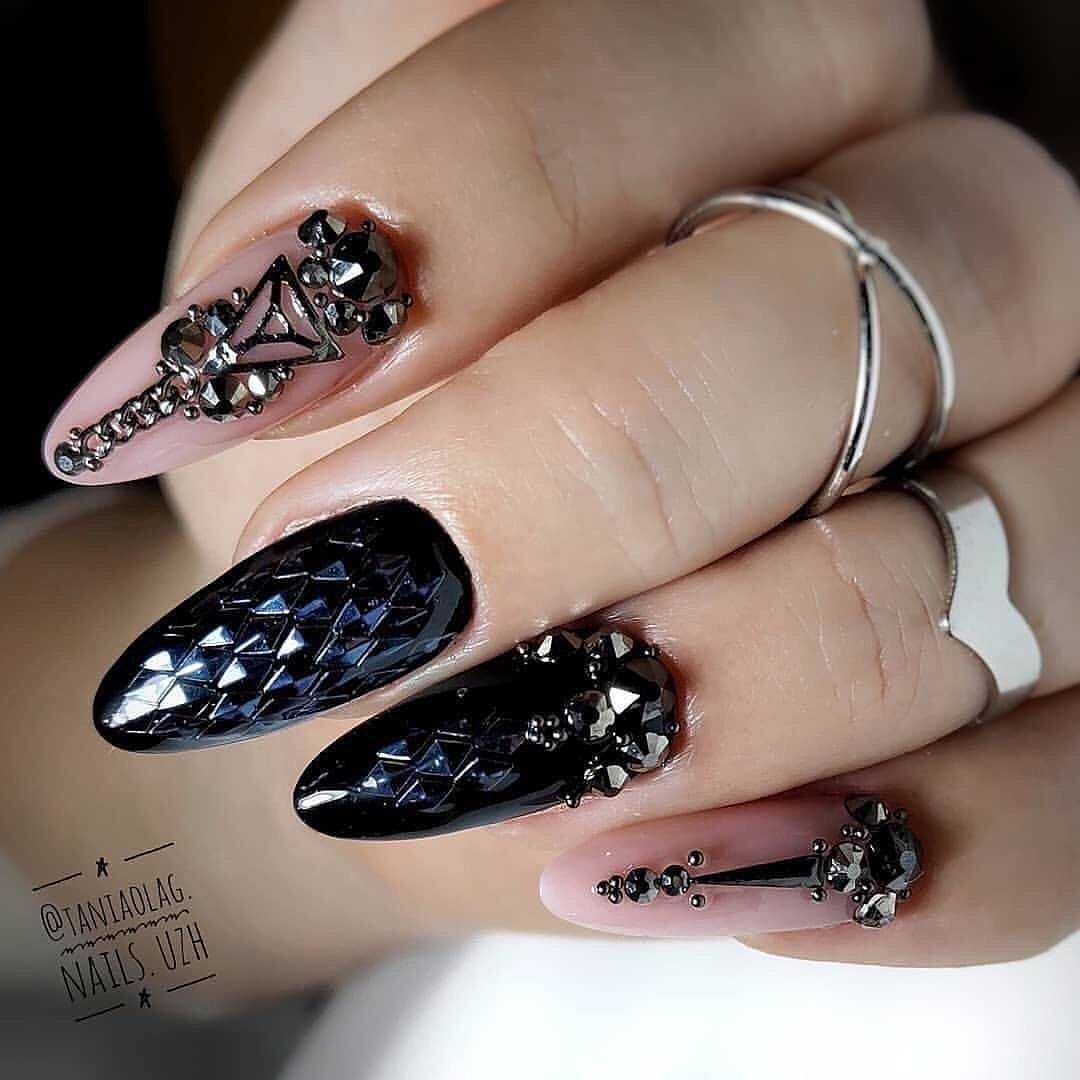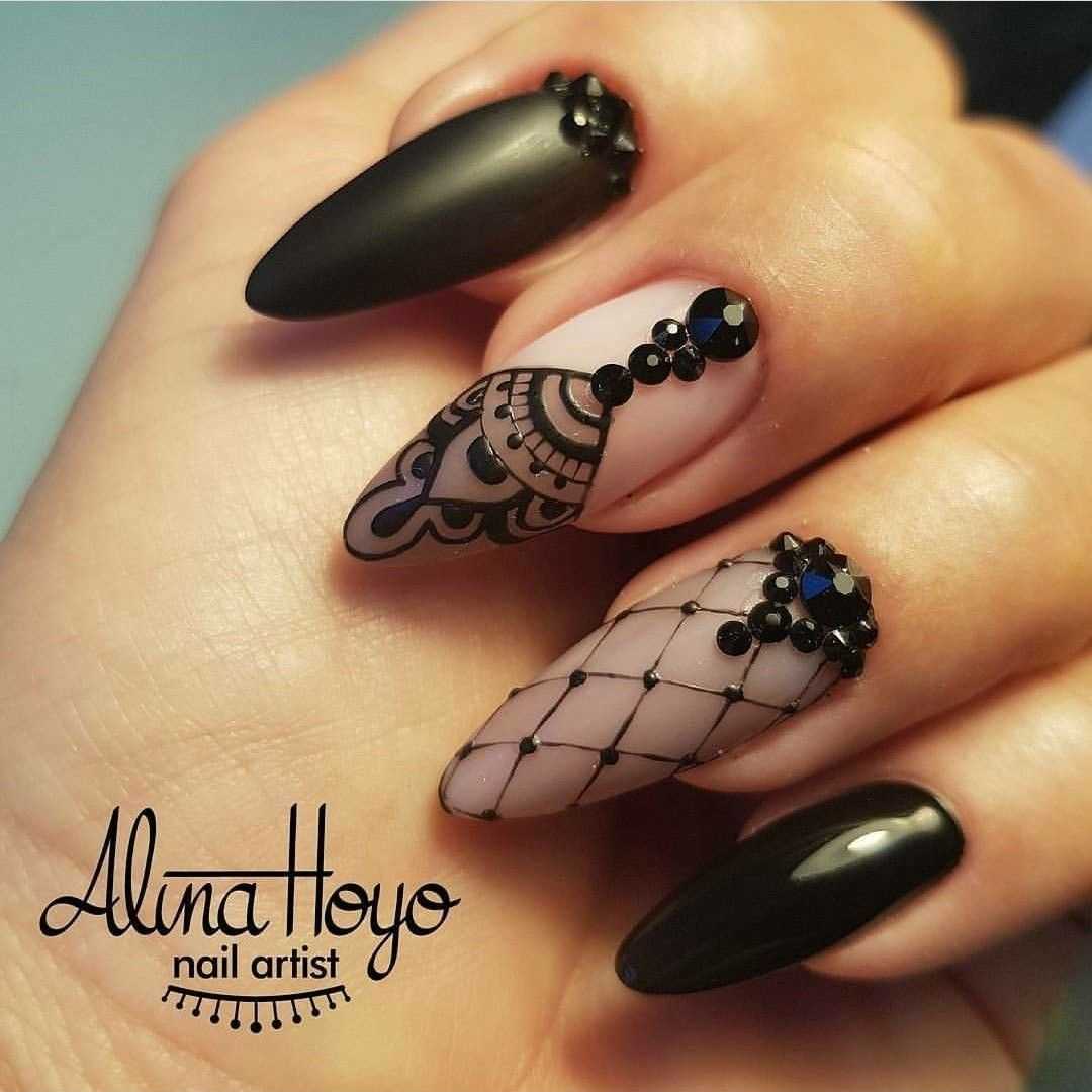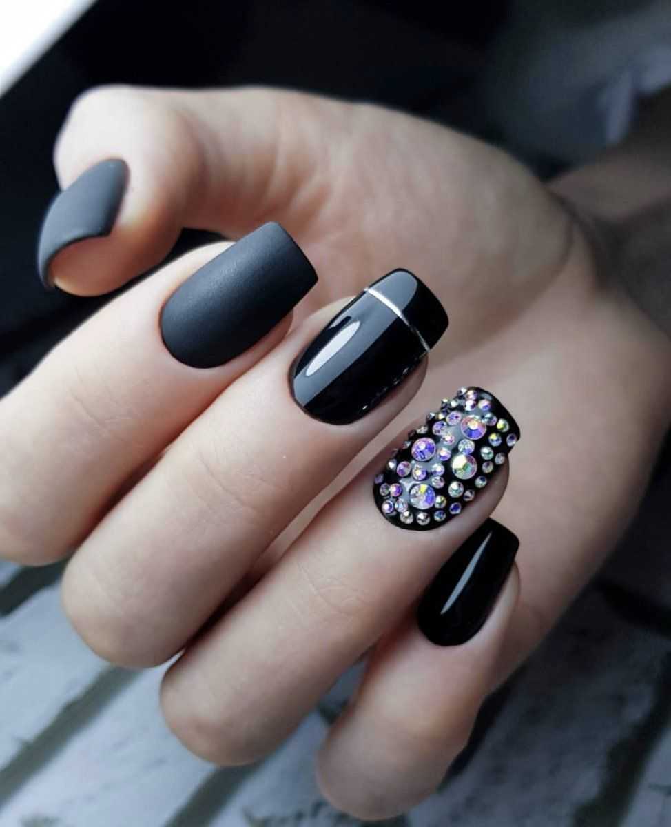 Черный маникюр великолепно смотрится на длинных миндальных и квадратных ногтях