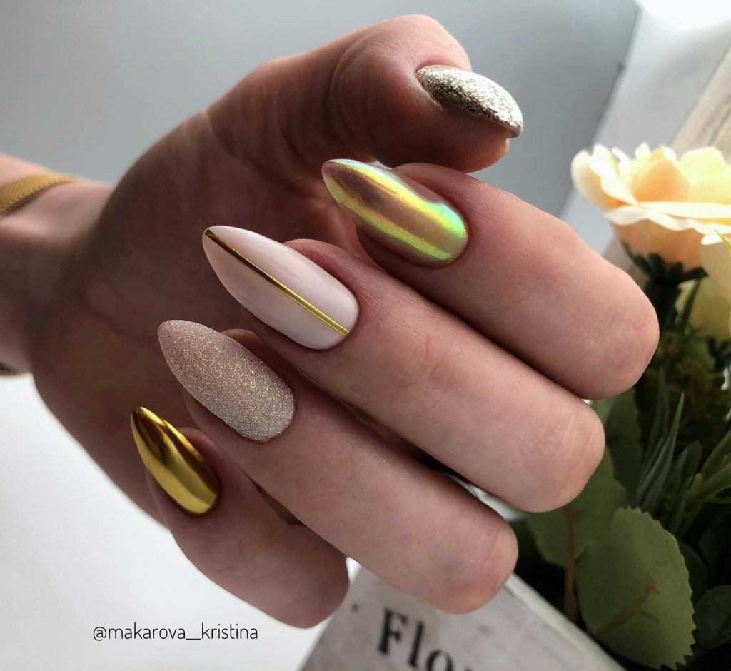 Праздничное золото стало классикой. С давних времен девушки надевали на мероприятия лучшие украшения. И хотя золотой бум ослаб, атрибуты золота в маникюре актуальны постоянно. Главное — умеренно использовать золото на короткой длине.