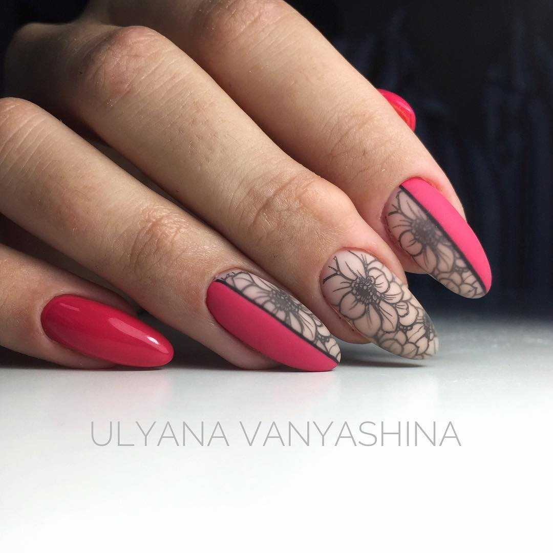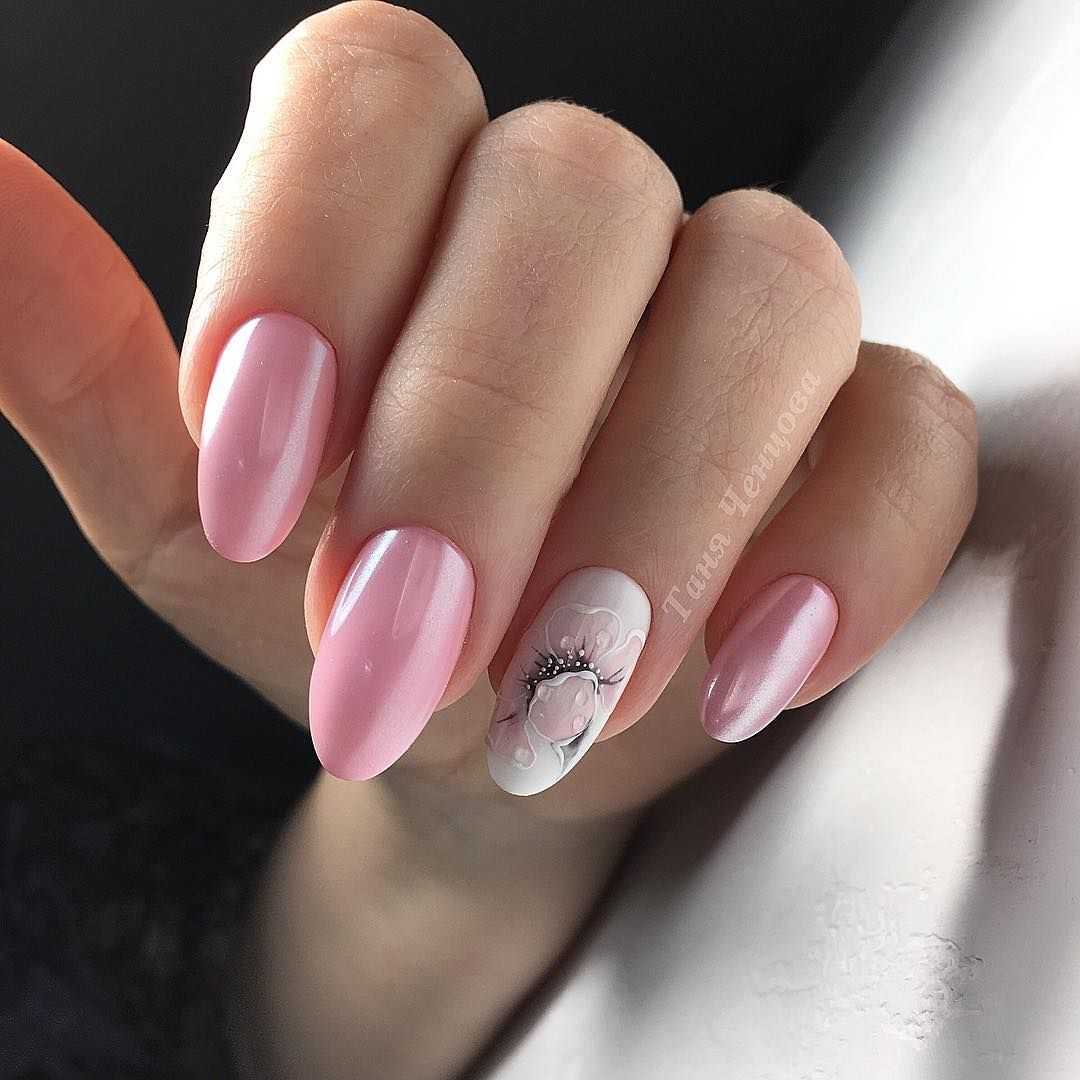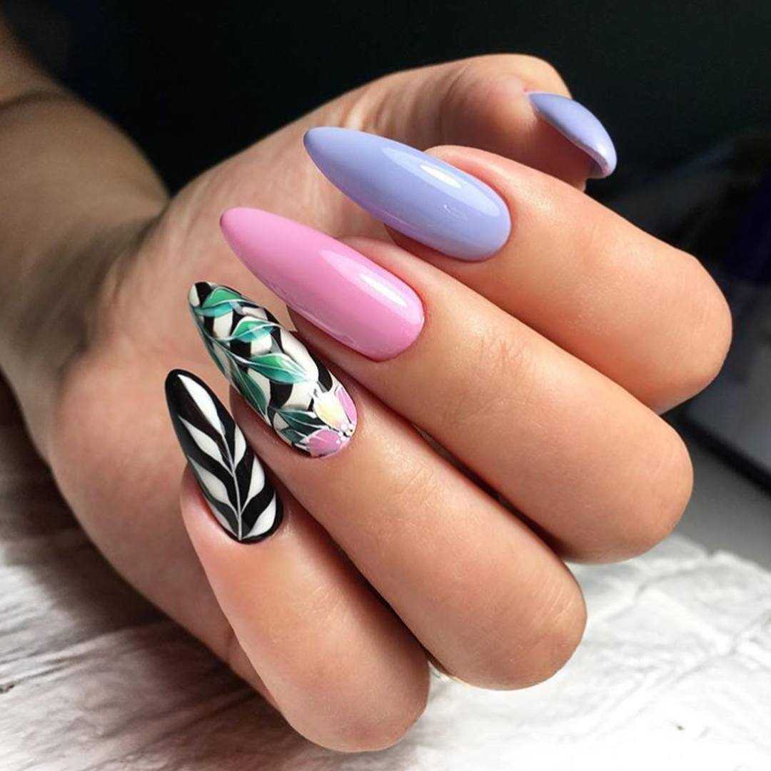 На миндальных ногтях шикарно смотрится дизайн с абстракцией, с надписями, летние узоры с листьями монстеры, с флористикой. Чередуйте рисунки с однотонным покрытием, так маникюр получится сдержанным и красивым.