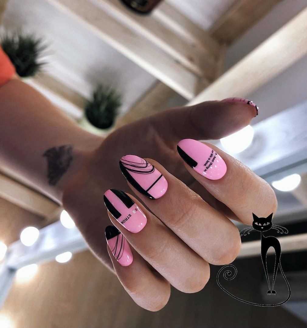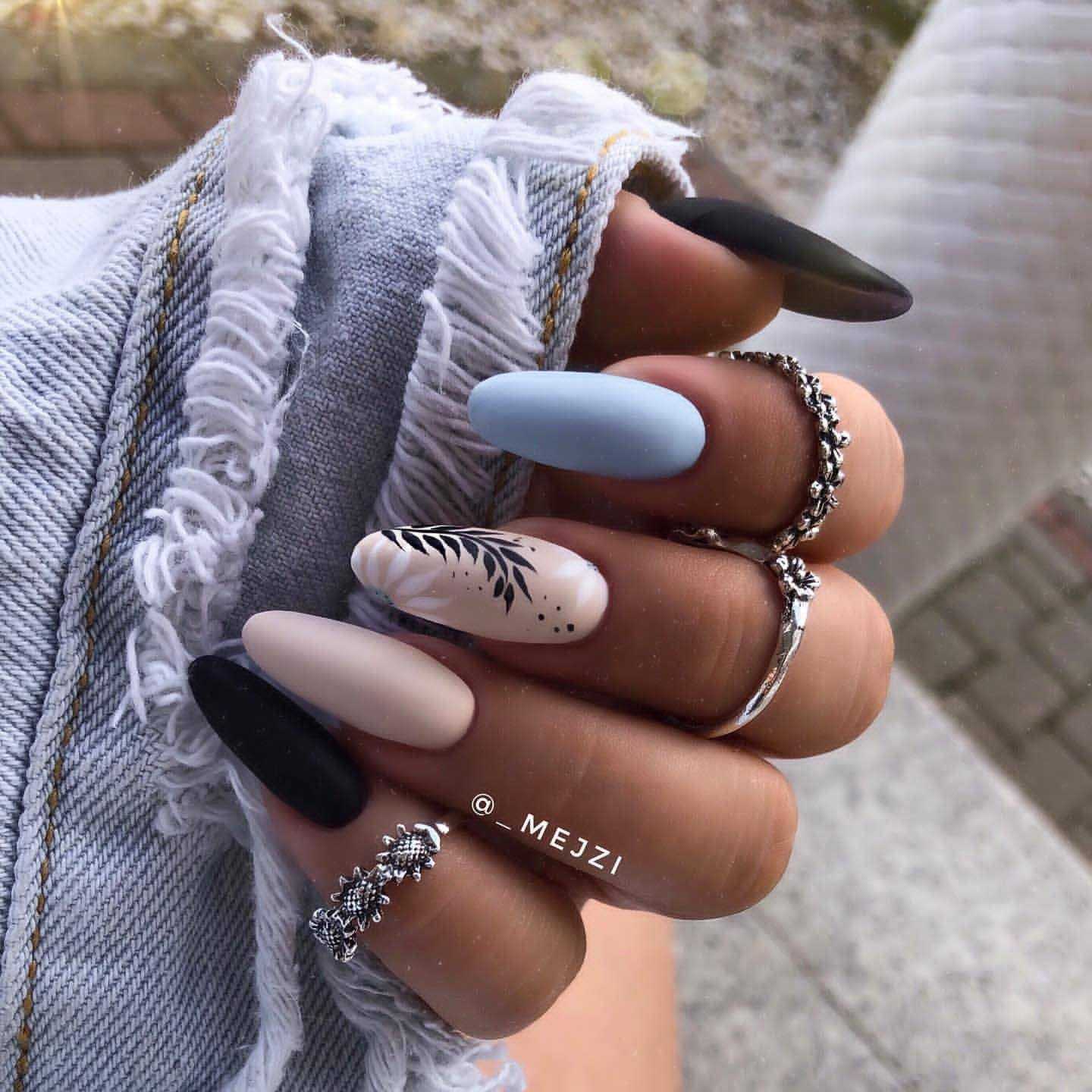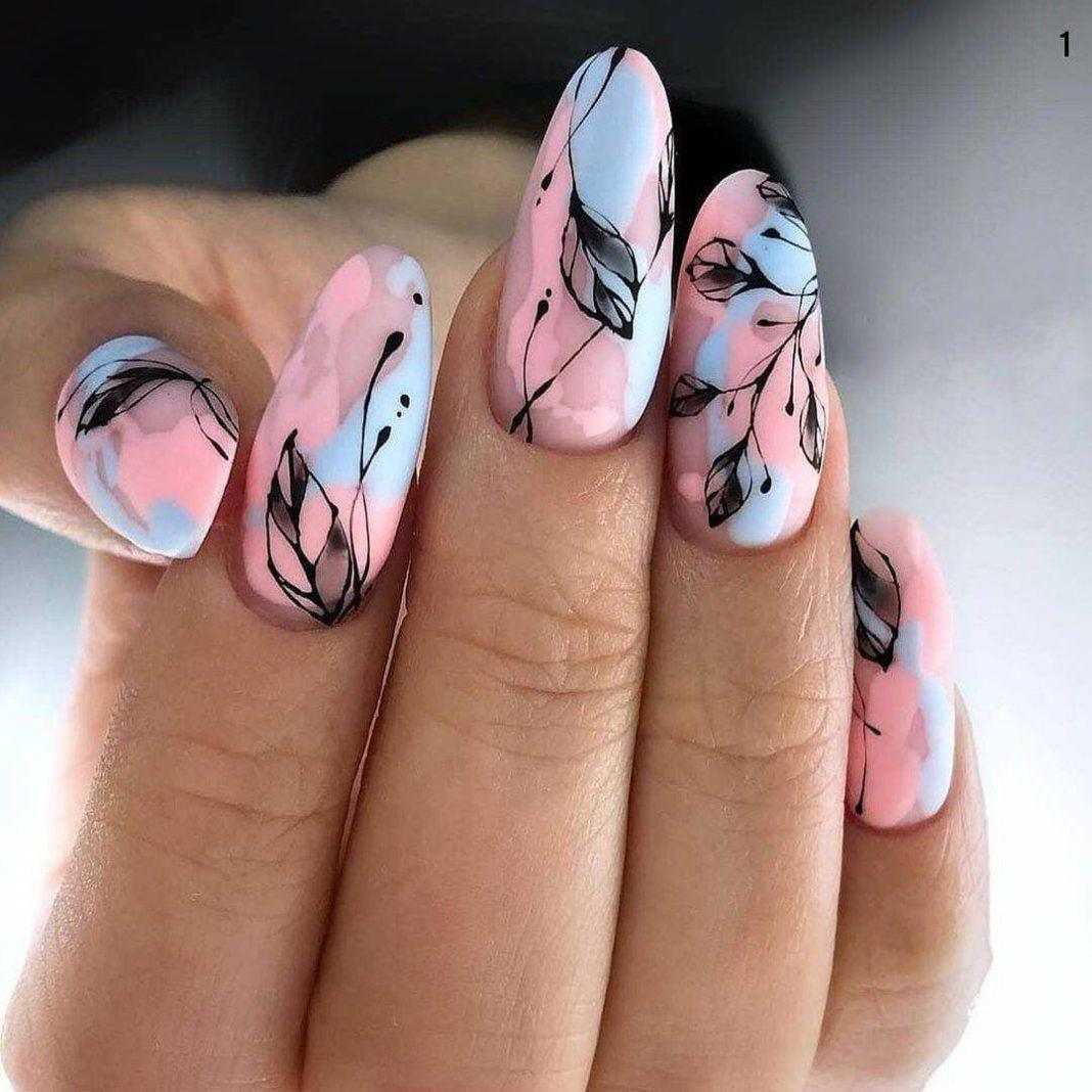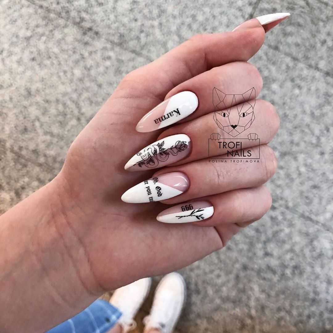 На миндальных ногтях шикарно смотрится дизайн с абстракцией, с надписями, летние узоры с листьями монстеры, с флористикой. Чередуйте рисунки с однотонным покрытием, так маникюр получится сдержанным и красивым.