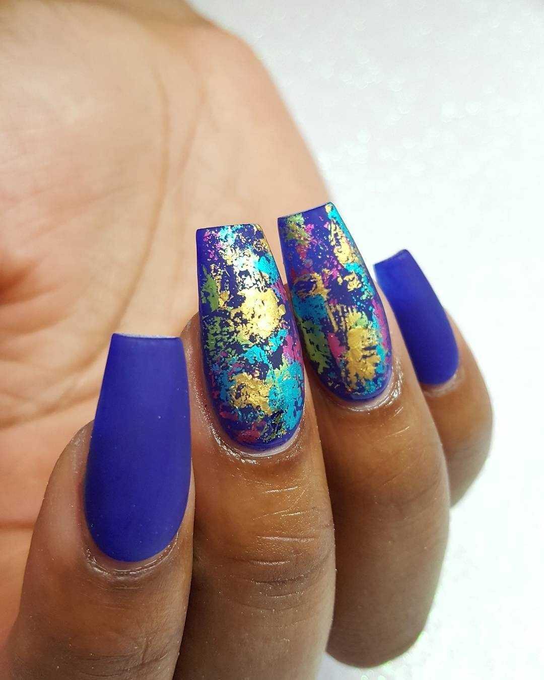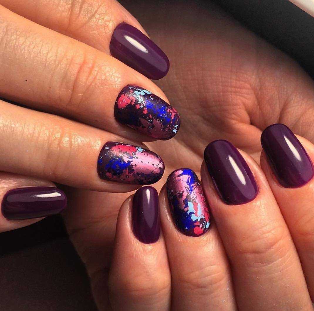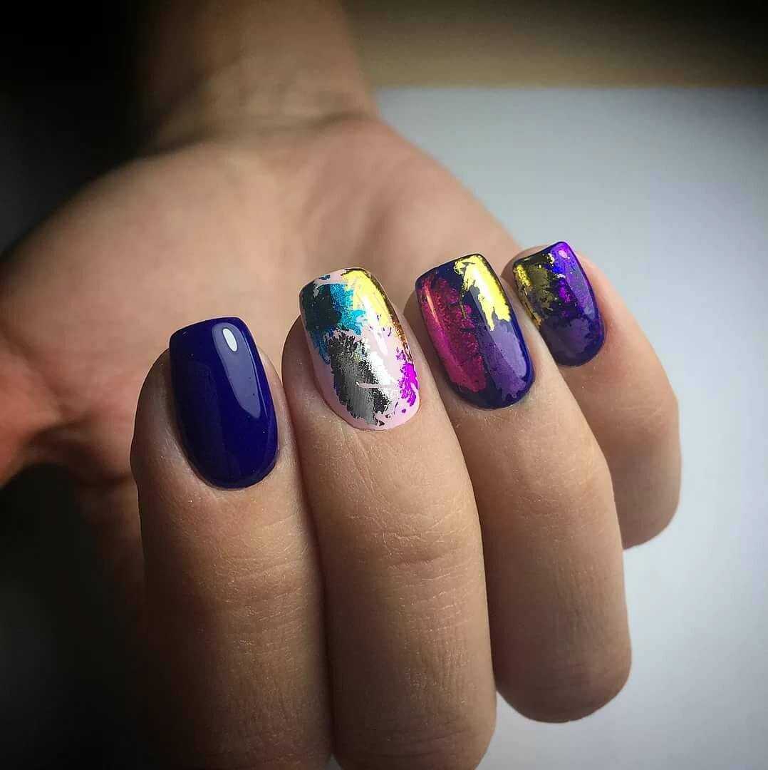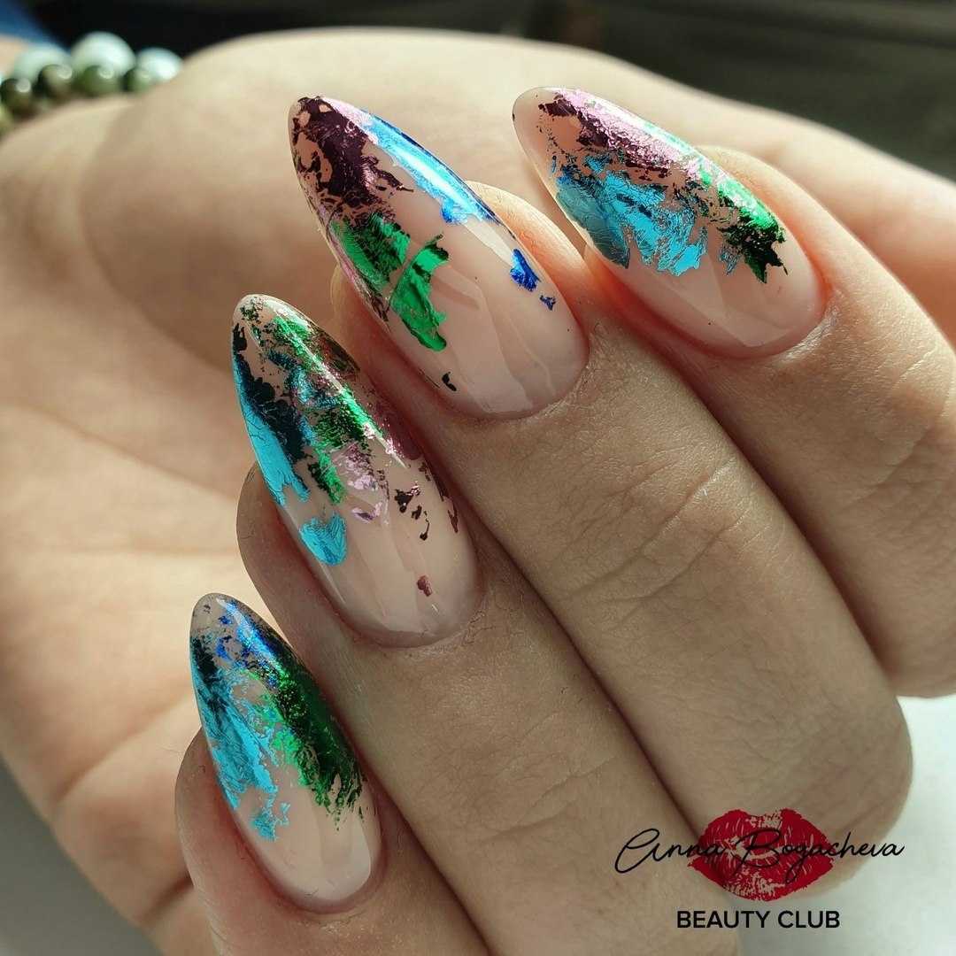 Фольга в качестве декора ногтевой пластины применяется достаточно давно. В новом сезоне она будет использоваться в трендовом дизайне, название которого «слеза единорога». Капельки разных цветов, переливающиеся благодаря фольге, прекрасно смотрятся, если использовать матовое покрытие. Такой маникюр выглядит сногсшибательно и подходит для вечернего выхода.
