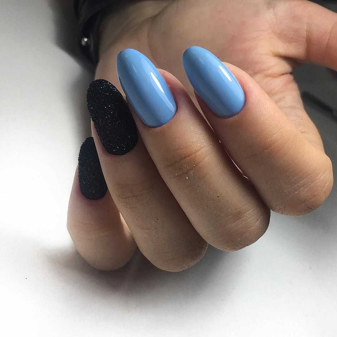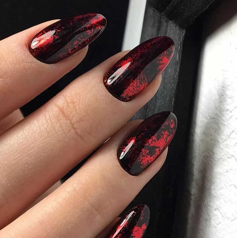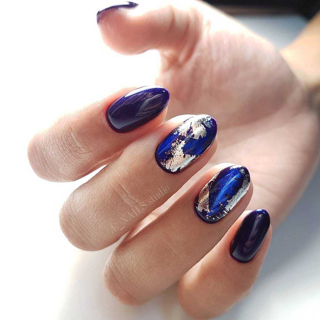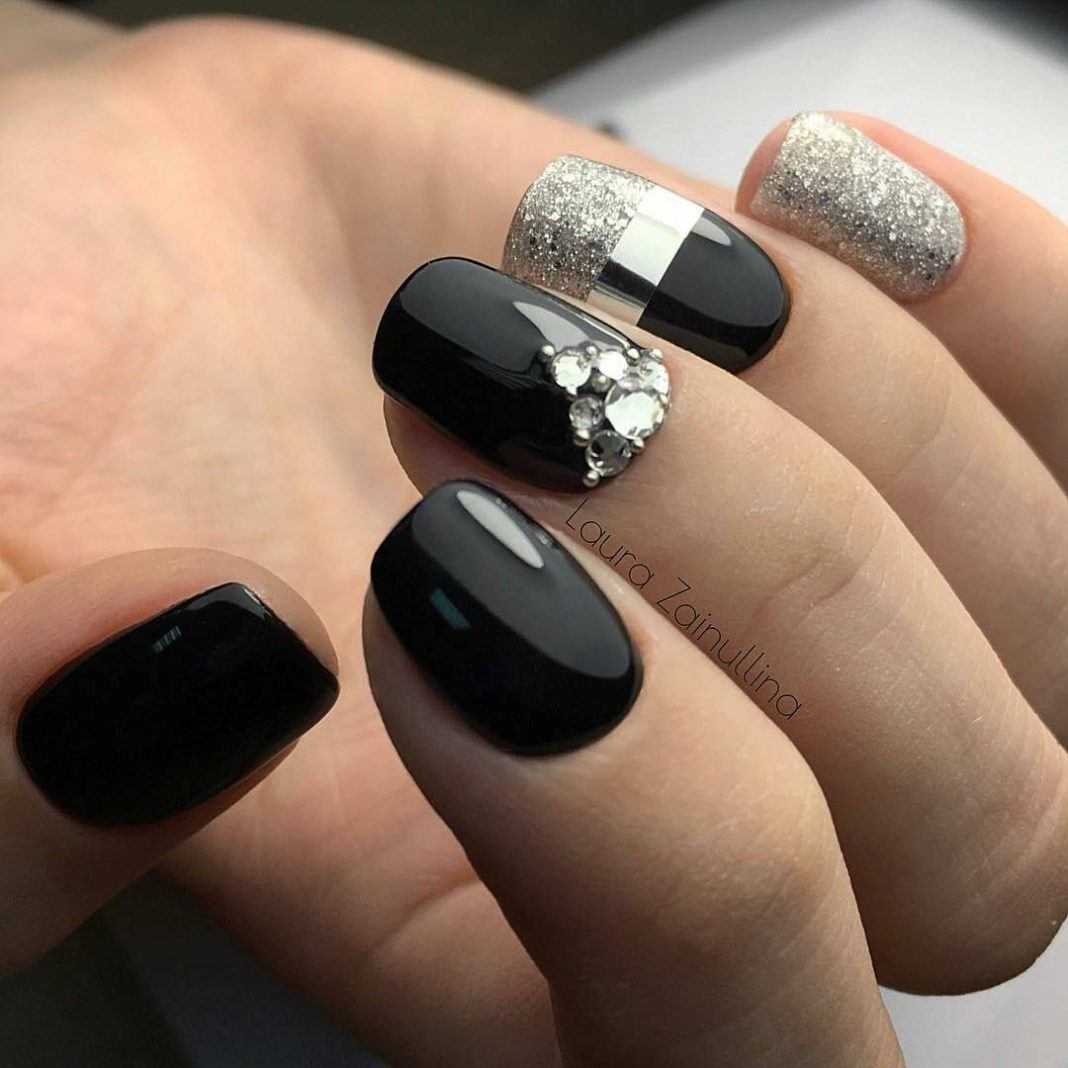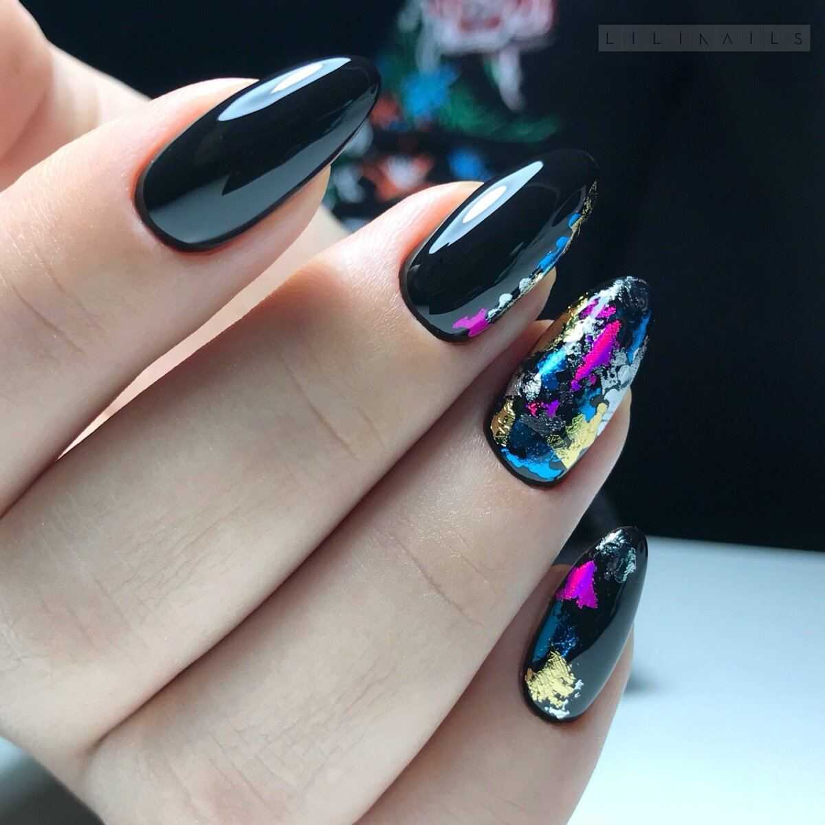 Черный маникюр вновь на пике популярности. Этот цвет используется не только в праздничных образах, но и в повседневных. Для праздничного образа можно создать однотонный черный маникюр с декором в виде серебряной фольги. Выполните оттиск в прикорневой зоне и стильный праздничный дизайн ногтей готов.