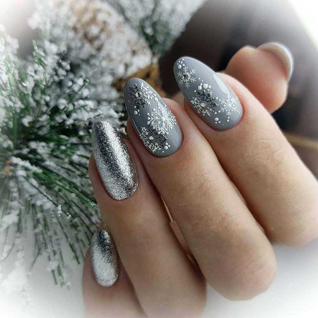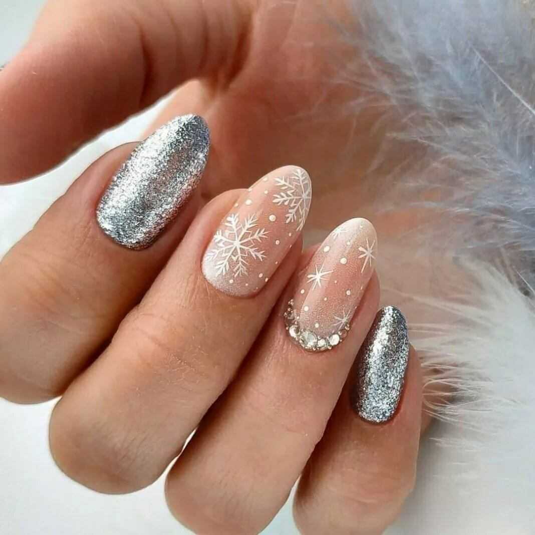 Особый тренд этого сезона — дизайн ногтей «Кошачий глаз» в кристаллах, серебре и золоте. Посмотрите, как красиво он светится. Вы можете сделать его в чистом виде, а можете добавить тематические новогодние узоры в виде снежинок.