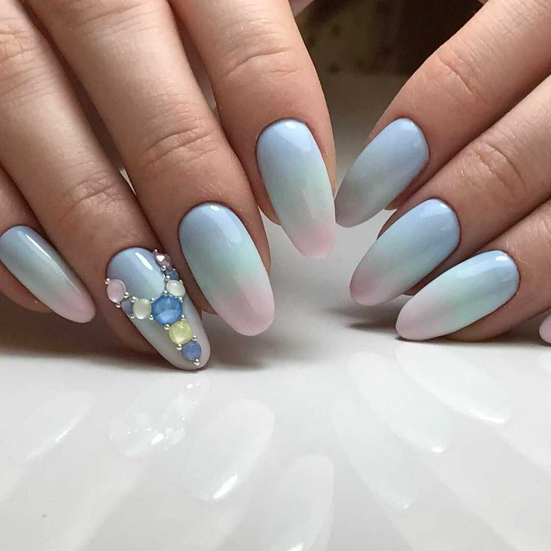 Особой нежностью на руках обладает эффект градиента. В основном используют светлые оттенки. Аккуратно исполненная растяжка добавляет рукам настоящую утонченность. Этот вариант отлично дополняют тонкими веточками, цветами, фольгой или блеском.