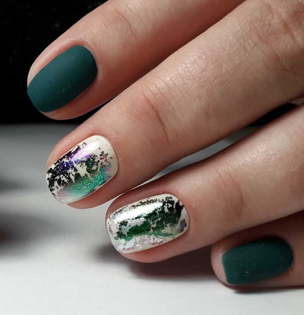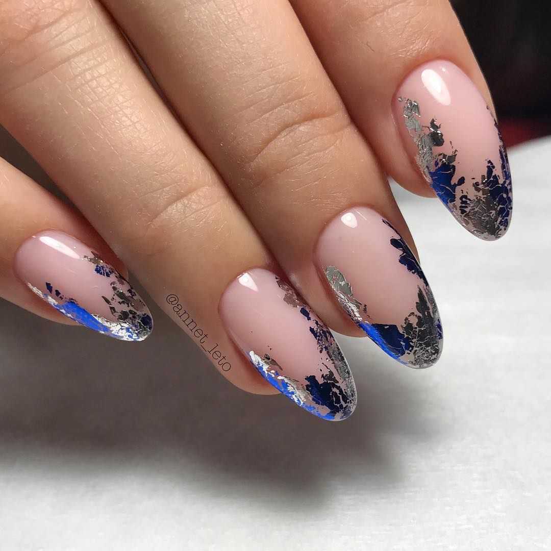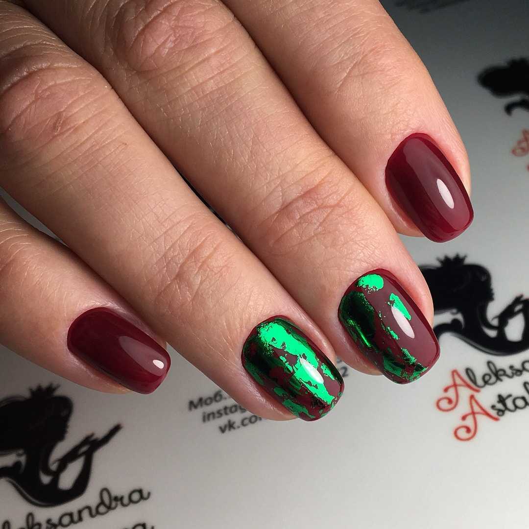 Фольга — самый модный вариант украшения ногтей. Эти очень тонкие металлические пластинки пригодятся для создания праздничных дизайнов. Они могут быть разных оттенков: платина, золото, медь, изумруд, рубин и другие. Если аккуратно нанести на покрытие элемент из фольги, можно получить красивый переливающийся орнамент разной формы и контура.