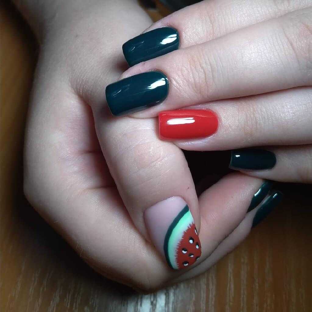 В тренде однотонное покрытие в яркие оттенки, маникюр «разные ручки», матовый яркий маникюр. В летних образах шикарно смотрится дизайн с фруктами в разрезе, флористика, дизайн с хищным принтом, геометрический яркий дизайн.