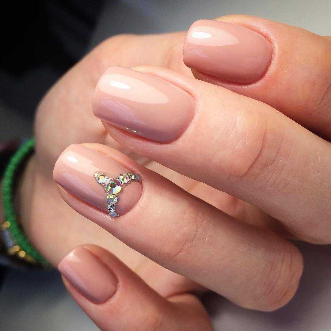 Нюдовые оттенки – беспроигрышный вариант, т. к. визуально они удлиняют ногти и подойдут для дам, у которых на работе строгий дресс-код.