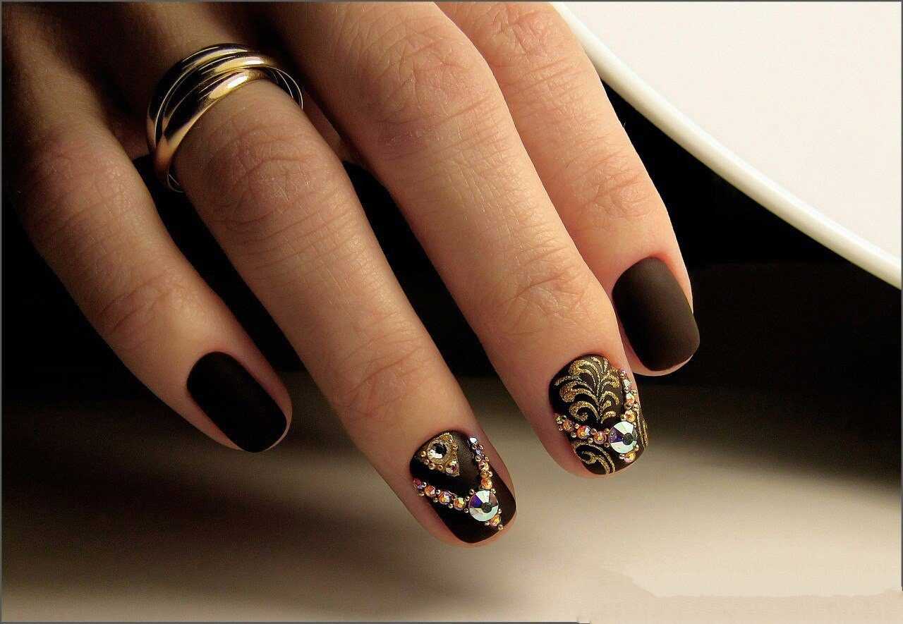 Помимо фольги черный маникюр можно дополнить серебряными стразами или бульонками. Располагайте декор в прикорневой зоне, так маникюр будет выглядеть сдержаннее и элегантнее.