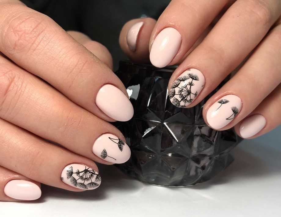 Особенно летом 2022 будут ценится простые одуванчики. Они выполняются в едином или множественном числе, где каждый цветок сможет украшать свою часть ноготка. Больше всего пользуется популярностью черно-белый рисунок на пастельном тоне.