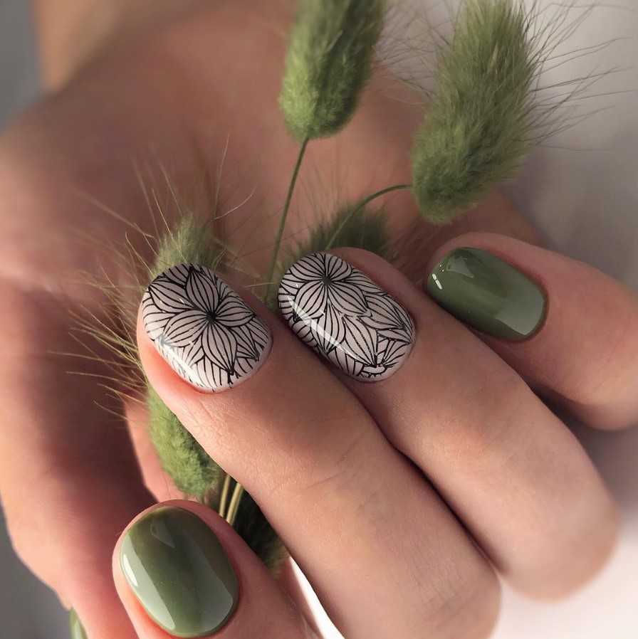 - Лидирующими станут вся зеленая цветовая гамма и цвет хаки для дизайна ногтей.