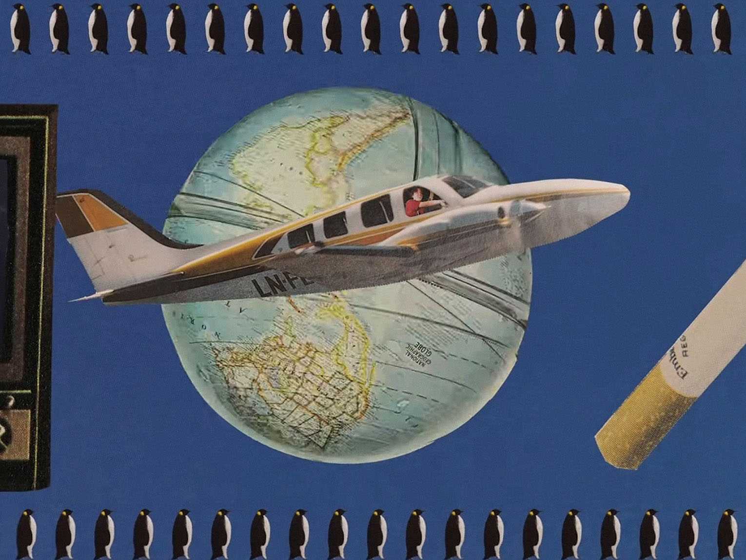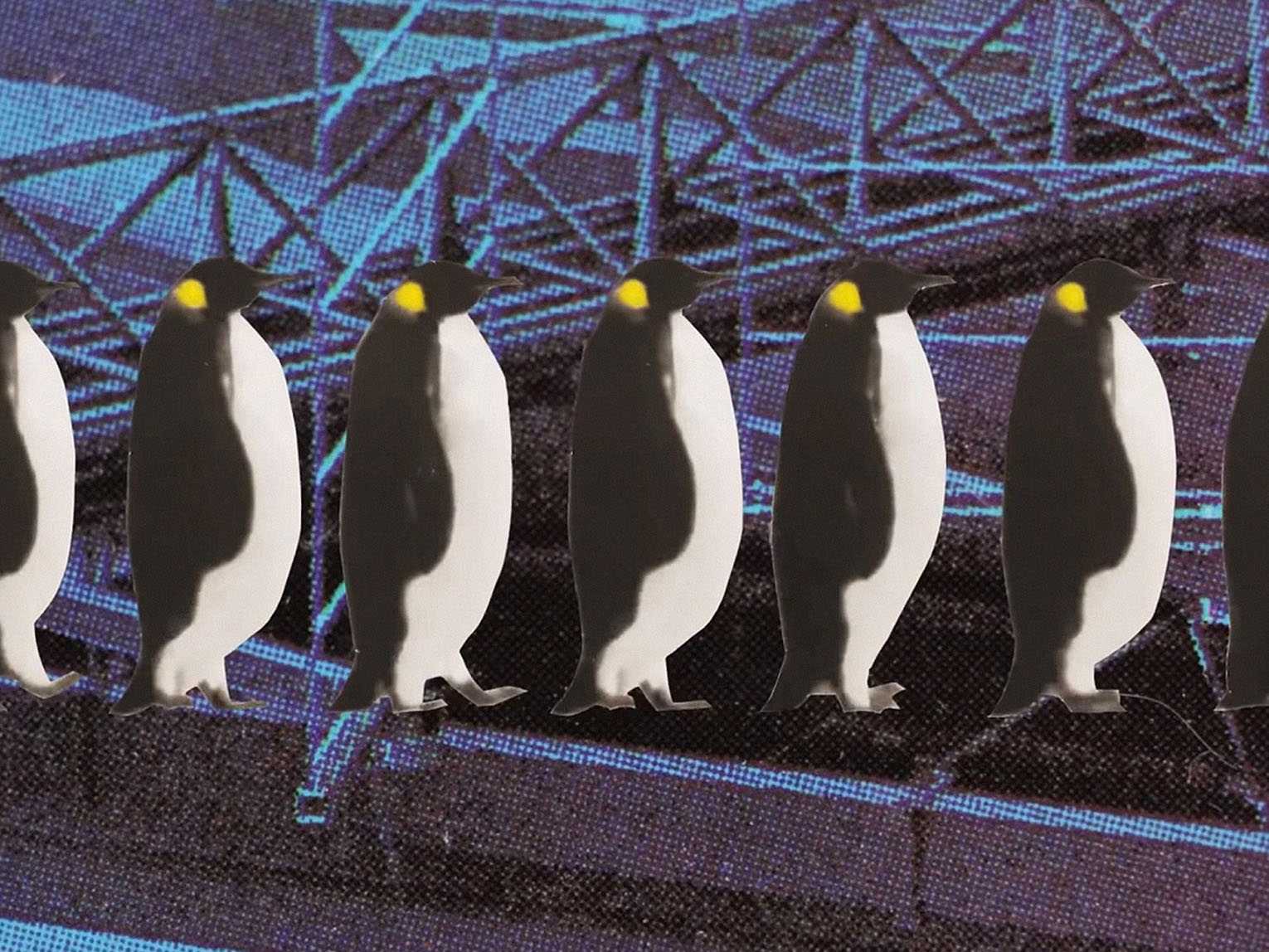 На технику стоп-моушн. За счёт покадровой съёмки сцен создаётся иллюзия того, что предметы двигаются самостоятельно. Это шагающие по коллажам пингвины, крутящаяся по сторонам голова солиста и улетающий вдаль самолёт. Посмотрите на переходы от одной сцены к другой.