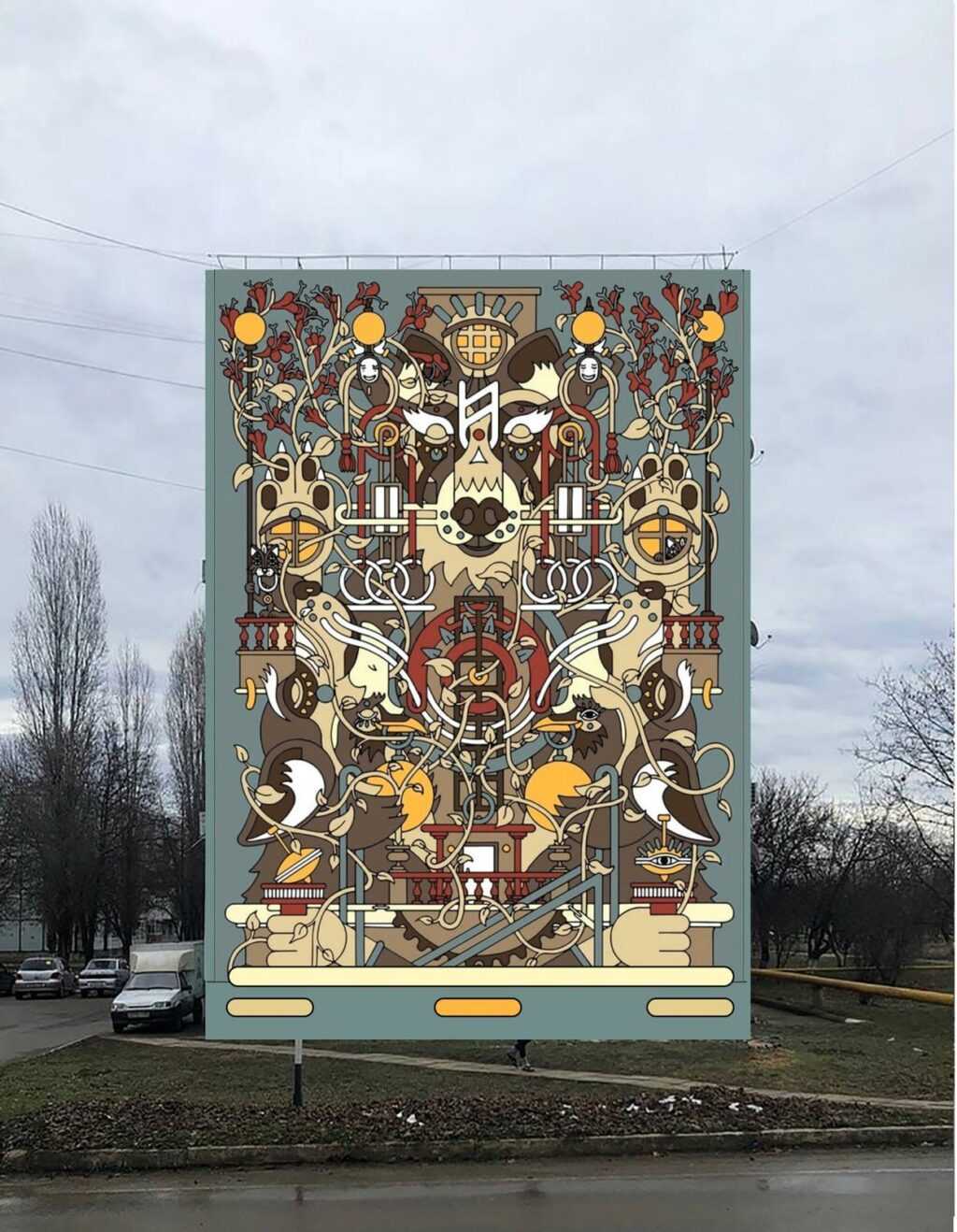 Я считаю себя постграффити-художником. Граффити — это чаще всего шрифты. У меня же шрифты зашифрованы — они превращаются в элементы архитектуры, в украшения героев, они становятся частью фона. И вместе с тем мне интересна тотемная эстетика, тотемы в принципе. Например, я делал тотемы районов Тель-Авива — районы сильно друг от друга отличаются, и, когда я туда приехал, мне это сразу бросилось в глаза. Я стал ходить и спрашивать у людей, с какими образами у них ассоциируется территория, сам об этом думал, а потом визуализировал. Тотем района Тахана Мерказит, в котором много иммигрантов, я сделал в виде птицы в желтых носках.