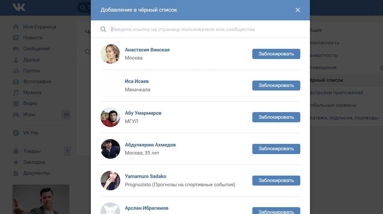 Введите Имя, Фамилию или ссылку на человека, которого хотите заблокировать.