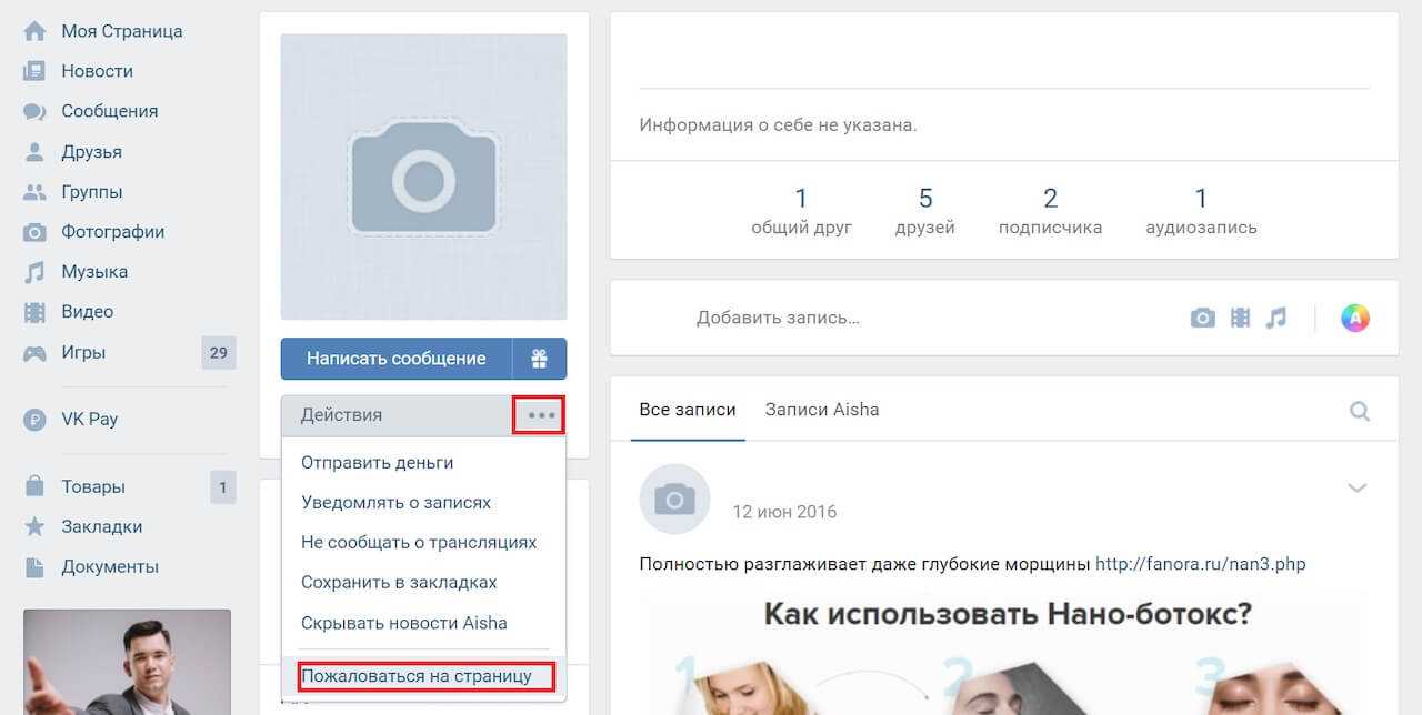 Например, если со страницы друга идет спам, можете заблокировать его, предварительно пожаловавшись в администрацию Вк. Для этого выполните следующий порядок действий.