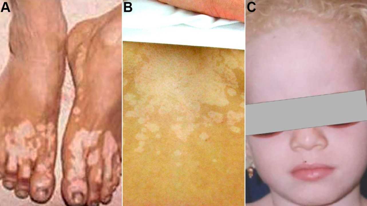 Заболевания, по симптомам похожие на витилиго. A — Химическая лейкодерма. Фото: Indian journal of dermatology / Open-i (Attribution 2.0 Generic). B — Отрубевидный (разноцветный) лишай. Фото: Sarahrosenau on Flickr.com / Wikipedia (Creative Commons Attribution-Share Alike 2.0 Generic license). C — Альбинизм. Фото: Oman journal of ophthalmology / Wikipedia (Attribution 2.0 Generic)